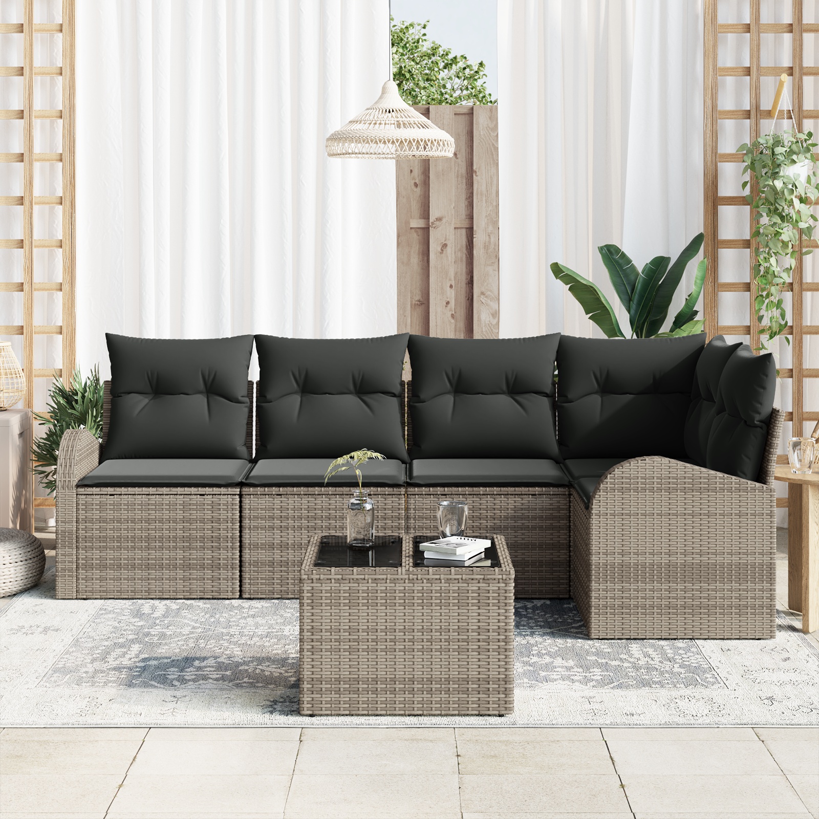 5-kusová záhradná súprava pohoviek s vankúšmi čierneho polyratanu, 2-sedadlová záhradná pohovka s úložným priestorom a vankúšmi sivého polyratanu
