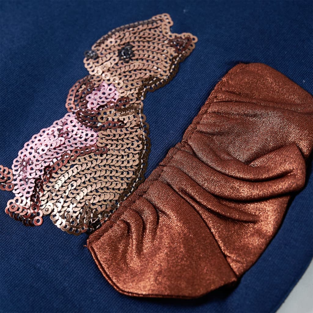 Táto detská mikina má dlhé rukávy, okrúhly výstrih a rebrované lemy na manžetách, výstrihu a v spodnej časti. Detský top má krásnu námornícku farbu s 2 flitrovanými veveričkami na jednom rukáve, ktorá dodáva extra zábavu. Pulóverová mikina je vyrobená z 95% bavlny a 5% elastanu pre pohodlie a priedušnosť. Mäkká flísová podšívka poskytuje extra teplo.