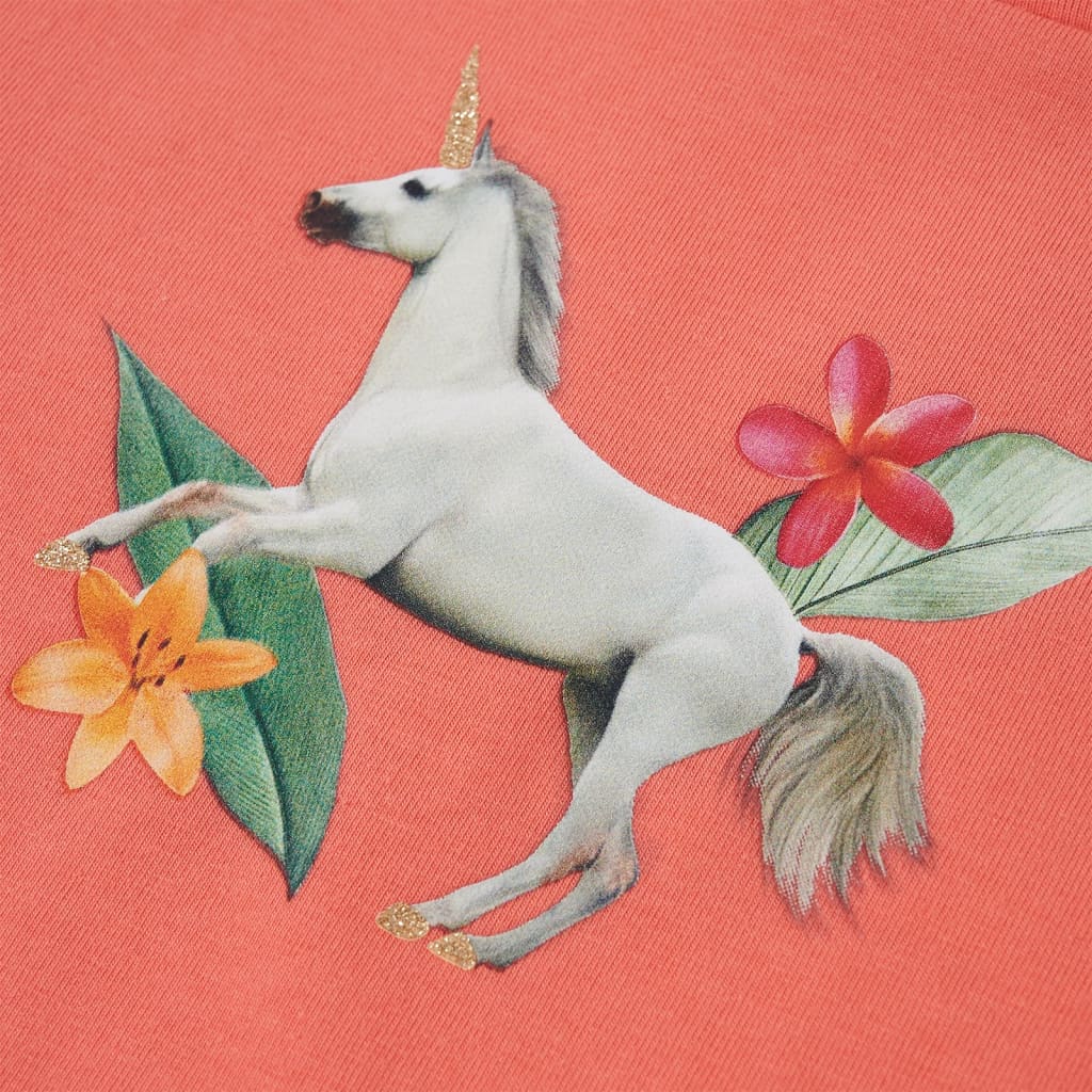 Toto detské tričko má krátke rukávy s volánmi, okrúhly výstrih a rovný strih. Na tomto detskom tričku je krásny jednorožec s listami a kvetmi. Detské tričko s krátkym rukávom je vyrobené z mäkkého materiálu s obsahom 95% bavlny a 5% elastanu pre pohodlie a priedušnosť.