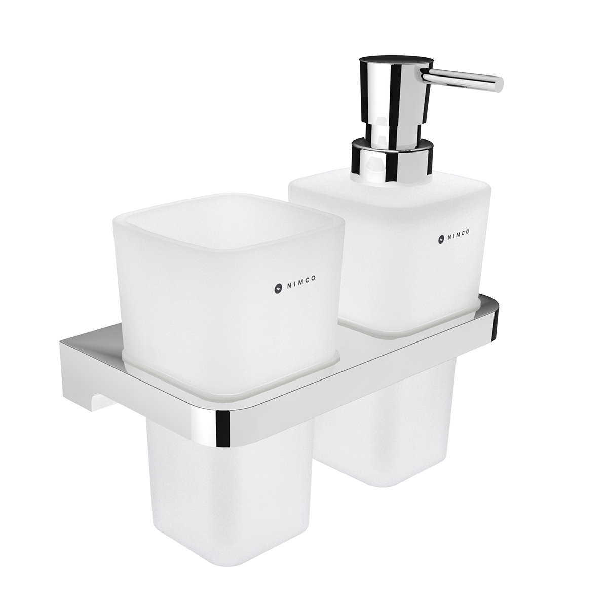 Dvojitý nástěnný držák na dávkovač mýdla a pohárek na zubní kartáčky z matného skla. Skleněné nádobky v kombinaci s chromovaným držákem perfektně ladí prostoru u umyvadla. Díky montáži na zeď je údržba umyvadla mnohem jednodušší. Dávkovač mýdla s plastovou pumpičkou, povrchová úprava chrom. Pro vyladěnou koupelnu doporučujeme i další produkty této designové řady.