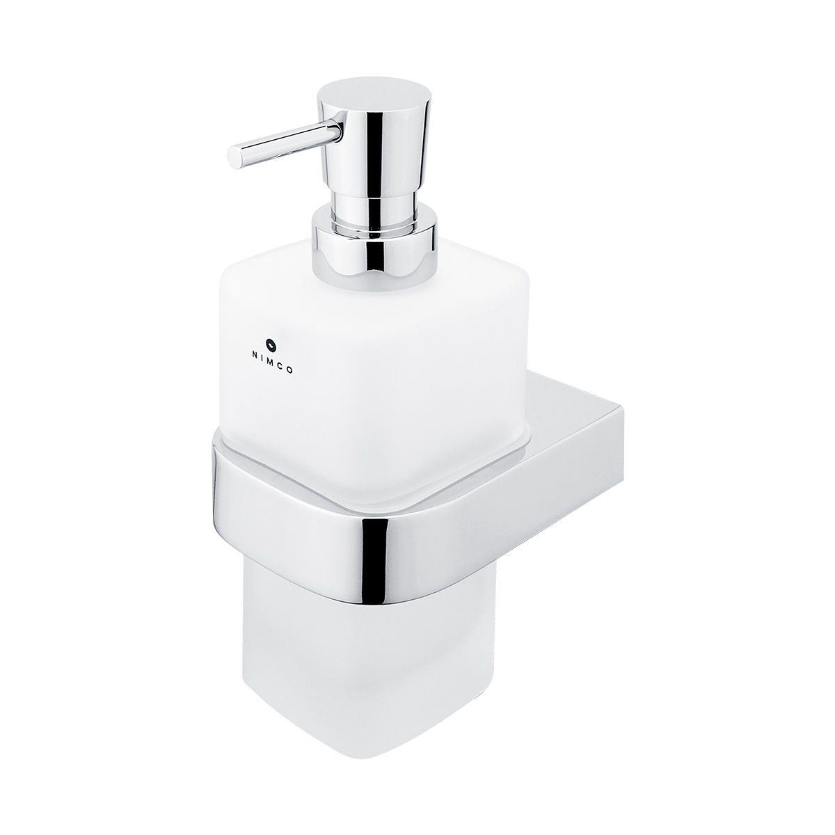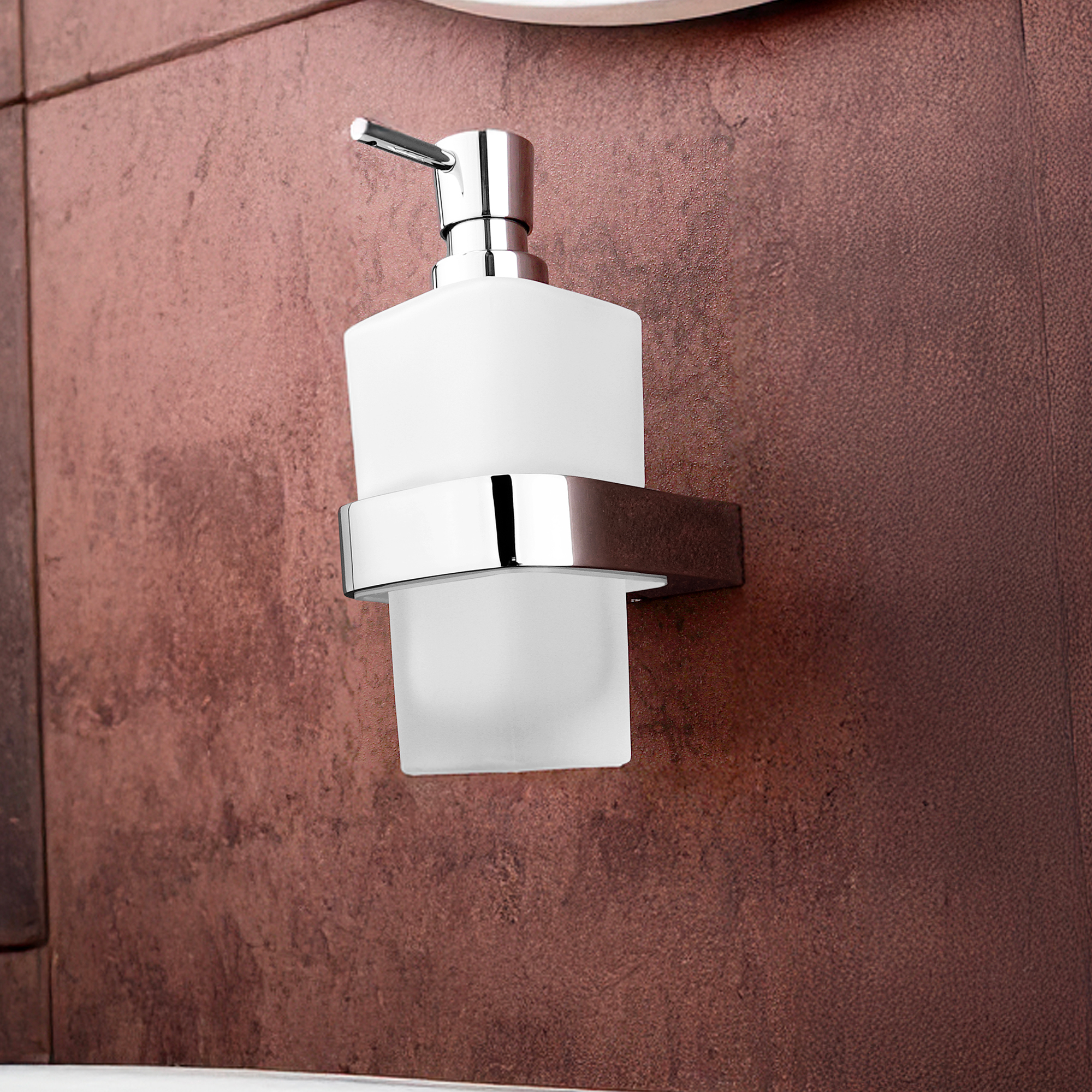Nástěnný dávkovač tekutého mýdla hranatý, matné sklo a chrom, pumpa mosaz je skvělým doplňkem do koupelny.