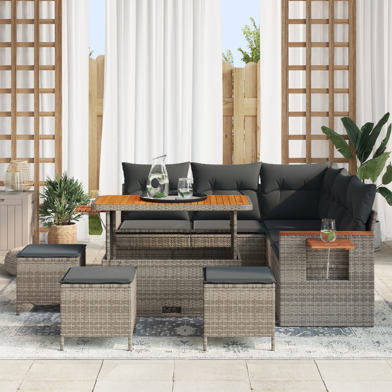 • Vyzerá pekne a moderne, so štýlovými sivými vankúšmi a stolom z prírodného dreva, skvelý pre každú vonkajšiu plochu.