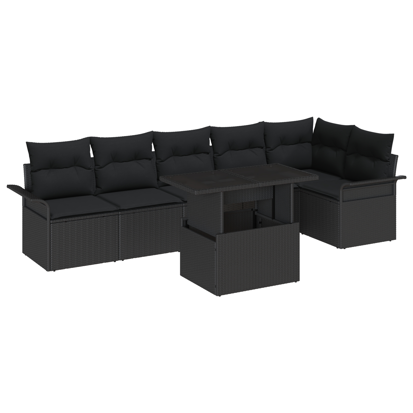 Súprava záhradných sedačiek vidaXL 7 kusov s vankúšmi Čierny poly ratan, Súprava 2-sedačkovej záhradnej sedačky vidaXL s úložným priestorom a vankúšmi Čierny poly ratan