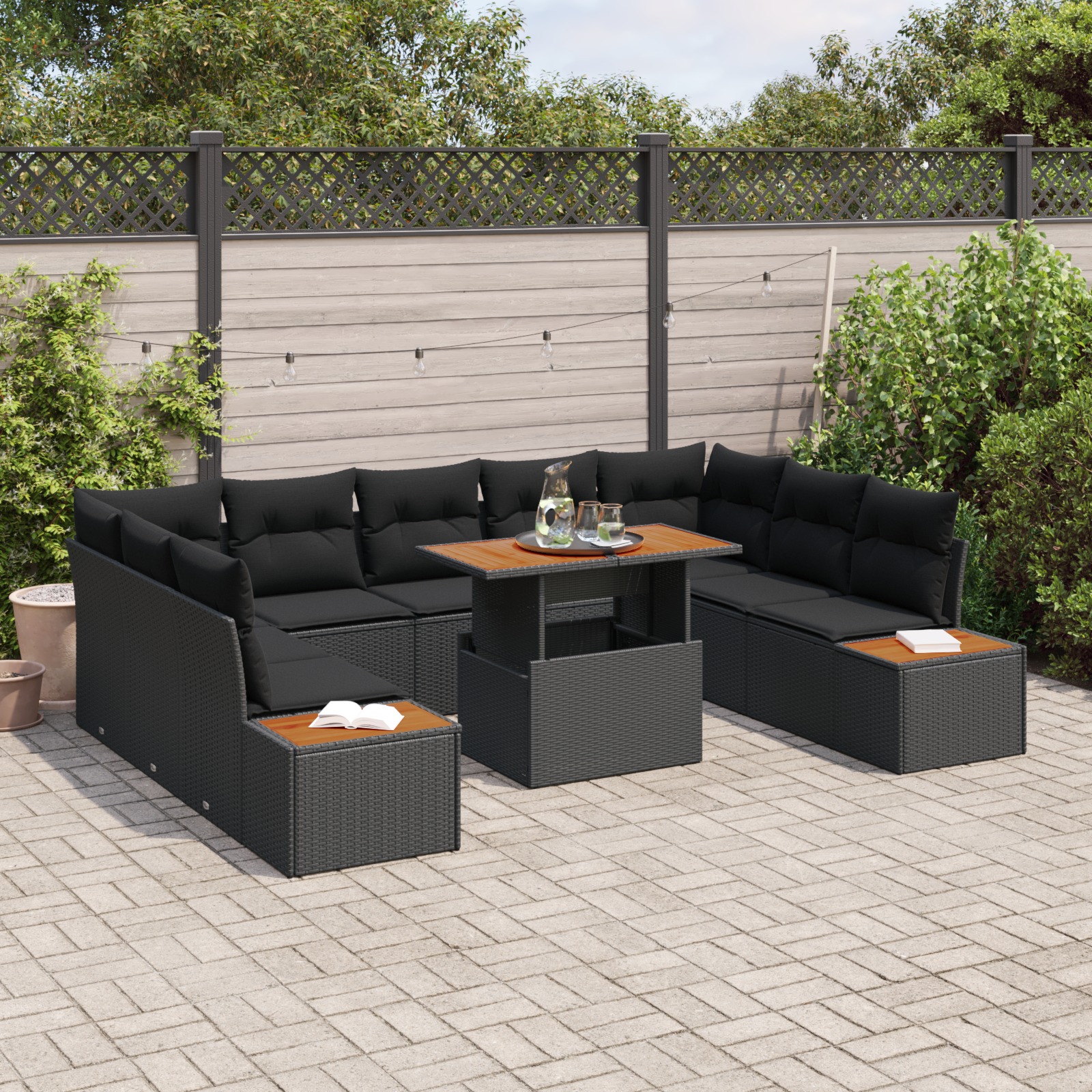 vidaXL 10-dielny záhradný jedálenský set s vankúšmi, čierny poly ratan akácia
