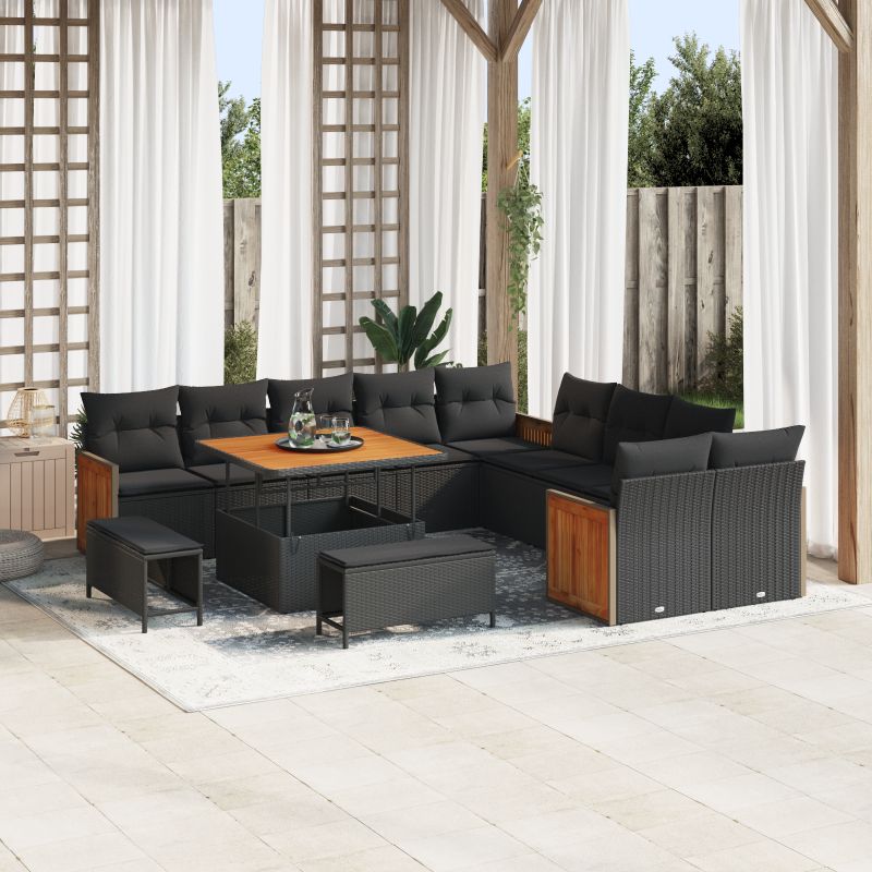 vidaXL 13-dielna záhradná pohovka s vankúšmi, čierny poly ratan, akácia