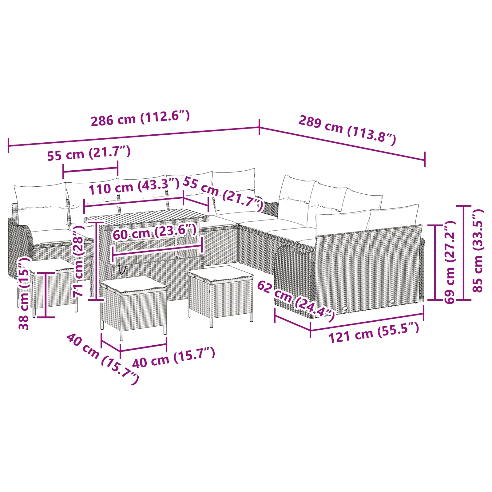 Toto štýlové 14-dielne záhradné sedenie je zo silného béžového poly ratanu. Skombinovaní štýlu a praktickosti pre akékoľvek vonkajšie miesto. Moderný dizajn prichádza s pohodlnými svetlosivými vankúšmi a pekným dreveným stolíkom, čo je perfektné na relaxáciu alebo akciu s priateľmi počas teplých večerov.