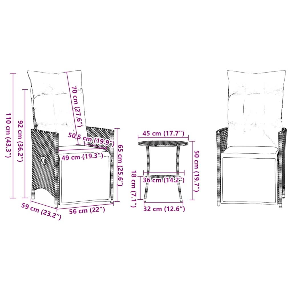 vidaXL 3-dielna bistro súprava s vankúšmi, sivá, polyratan