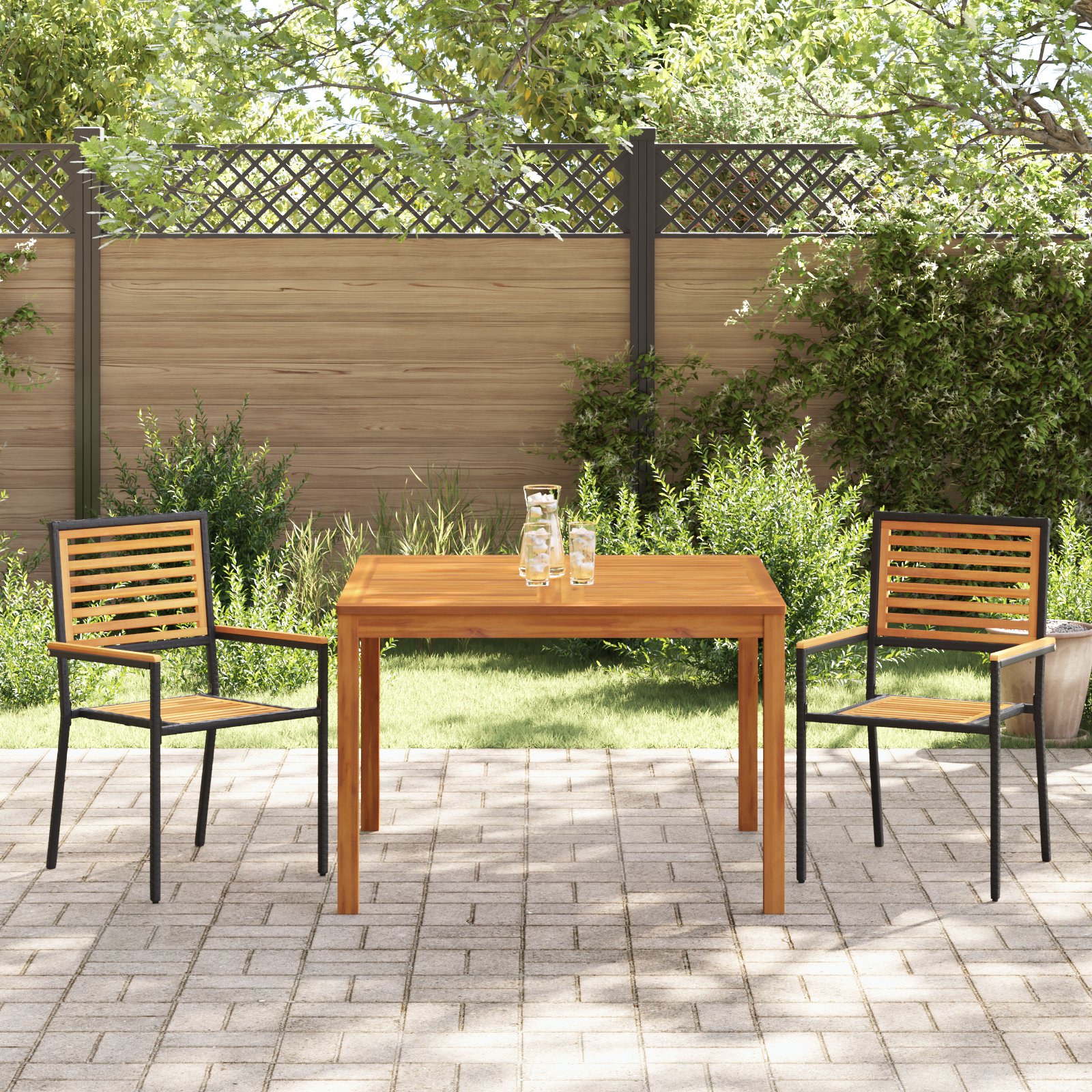 Táto úžasná súprava na posedenie v záhrade spojila moderný štýl s praktickosťou, ideálna na vychutnávanie vonkajších priestorov. S obdĺžnikovým stolom a dvomi elegantnými stoličkami je vyrobená z masívneho akáciového dreva a má kontrastný čierny železný rám, ktorý ponúka odolnosť a eleganciu pre jedlo či relax.