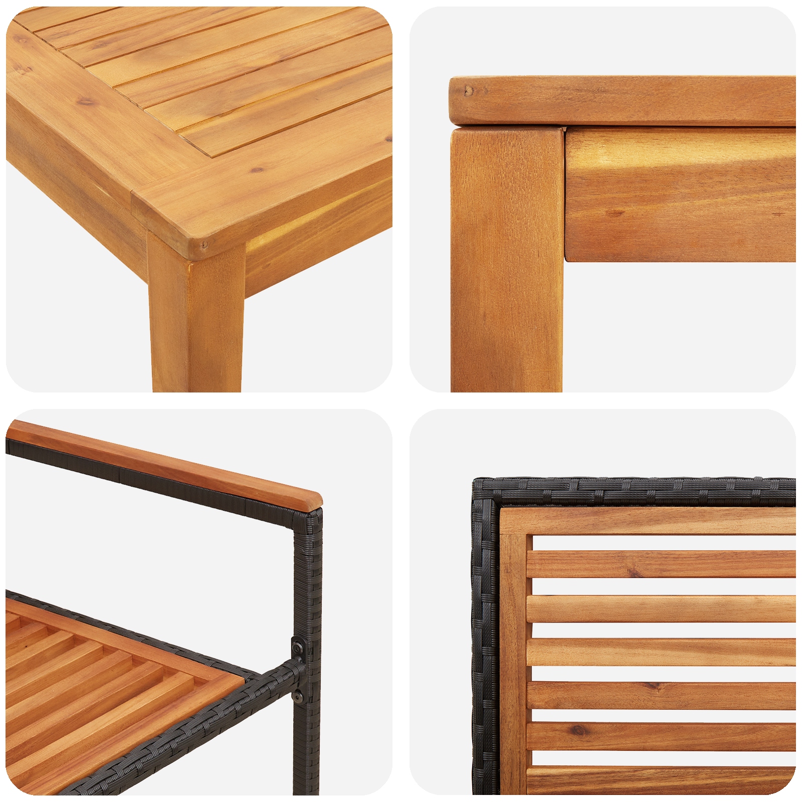 - Design: Moderný vzhľad má bezvadný mix prírodného dreva a elegantných čiernych prvkov, ktoré oživujú vašu vonkajšiu výzdobu. Hladký povrch a čisté línie vyzerajú naozaj sofistikovane.