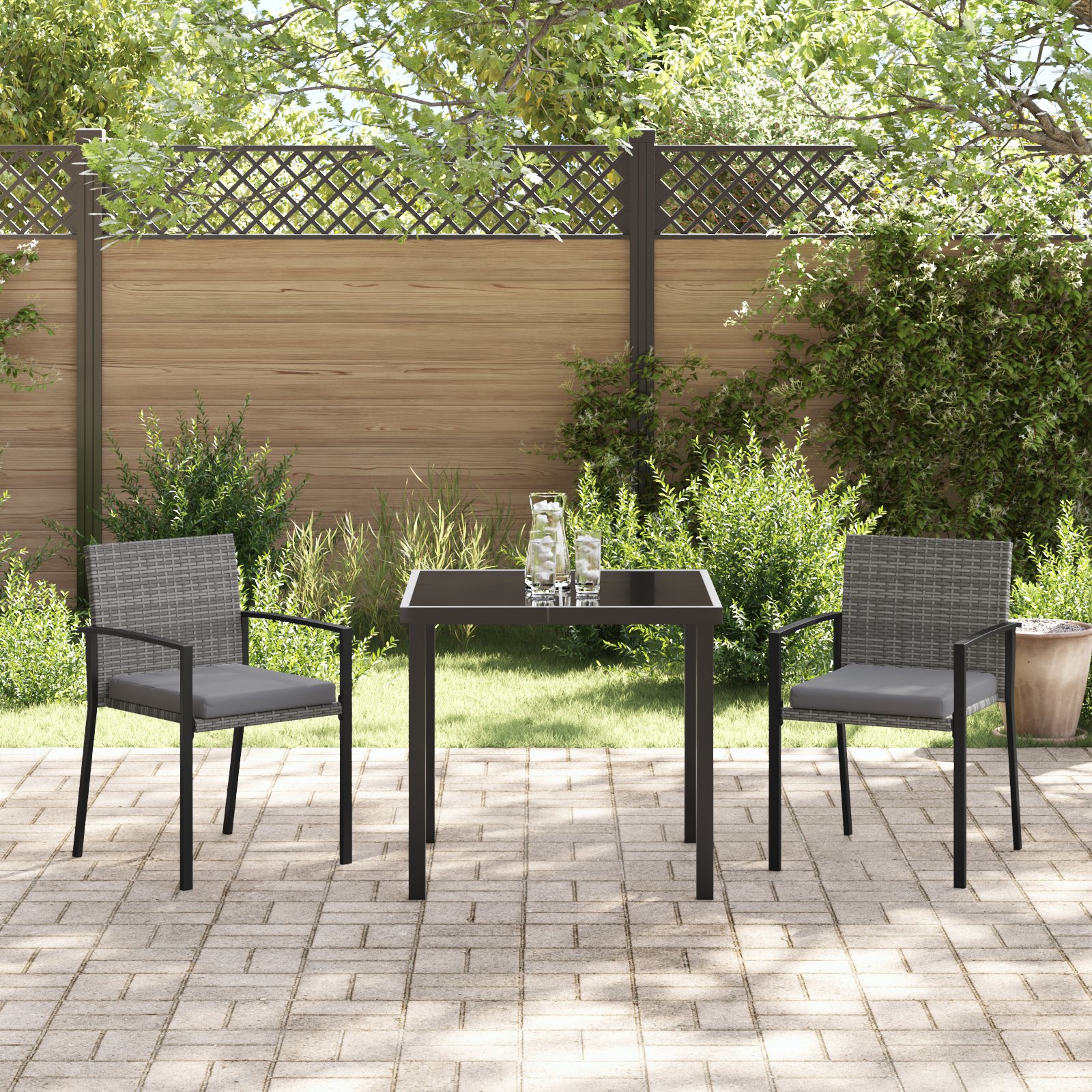 • Vysokokvalitné materiály: Pevná oceľová konštrukcia stoličiek je obalená v odolnom šedom PE ratane, čo zabezpečuje trvácnosť v vonkajších podmienkach.