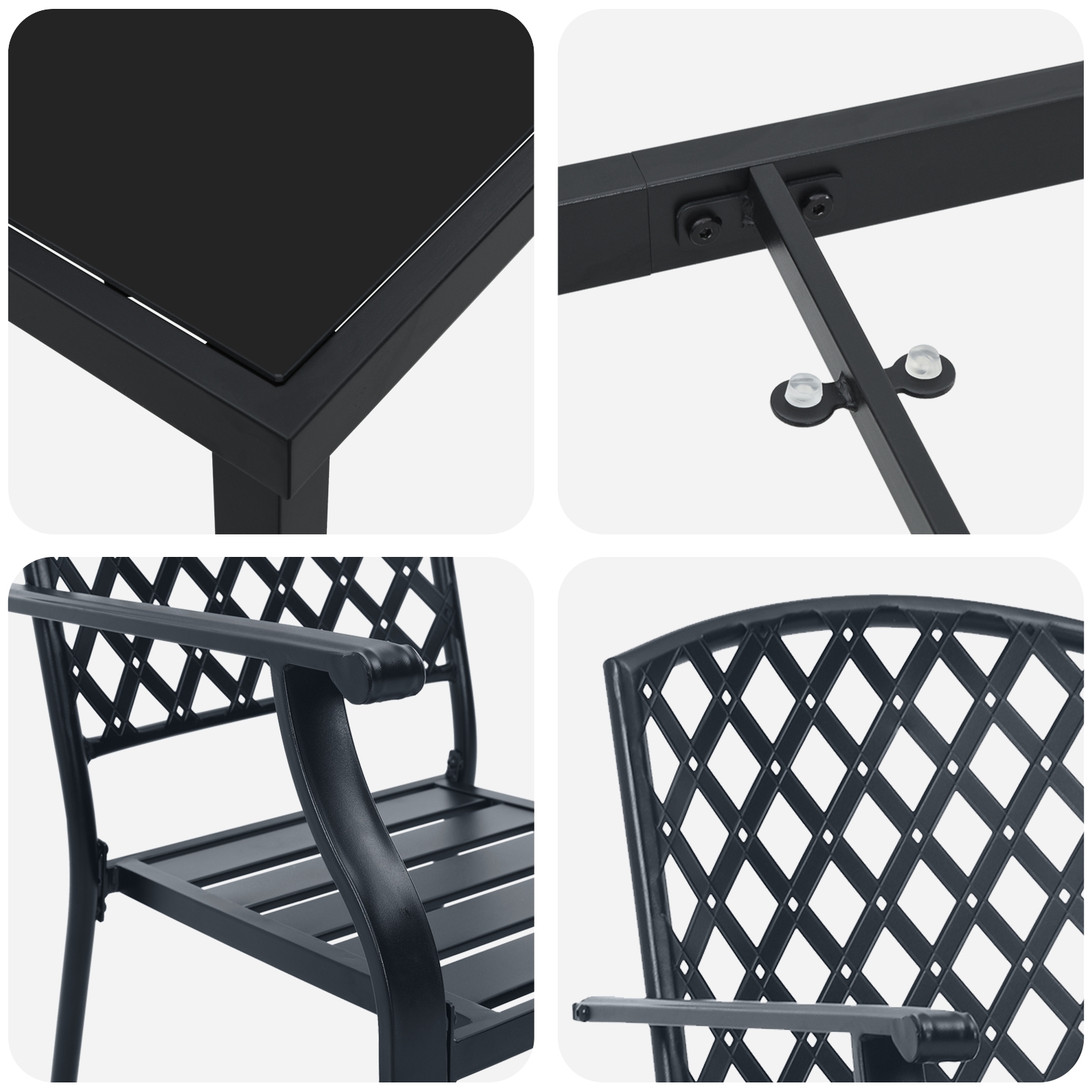 Tento 6 dielny záhradný jedálenský set je super doplnok na väčšie vonkajšie jedlá, pojme až šesť dospelých, ktorí sa môžu najesť alebo odpočívať. S modernou čiernou práškovou hliníkovou konštrukciou je perfektný na tvoj balkón alebo do záhrady. Kombinuje štýl s praktickosťou v akomkoľvek vonkajšom priestore.