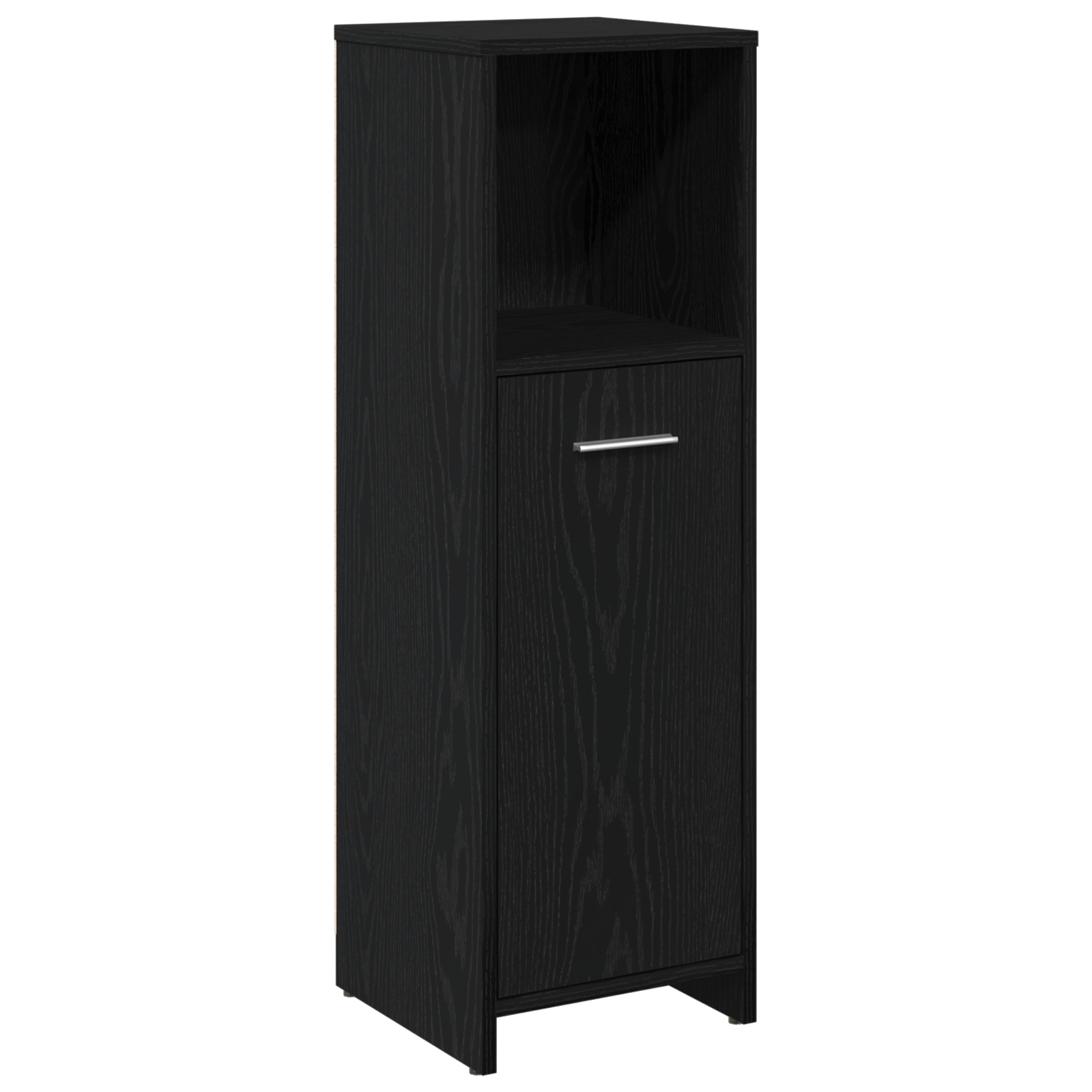 Súprava obsahuje voľne stojacu vysokú skriňu s dverami na pántoch a množstvo zabudovaných políc, všetko v štýlovej matnej čiernej dub. Textúrovaný dizajn a elegantná kovová rukoväť sa perfektne hodia k modernému a minimalistickému štýlu kúpeľní.