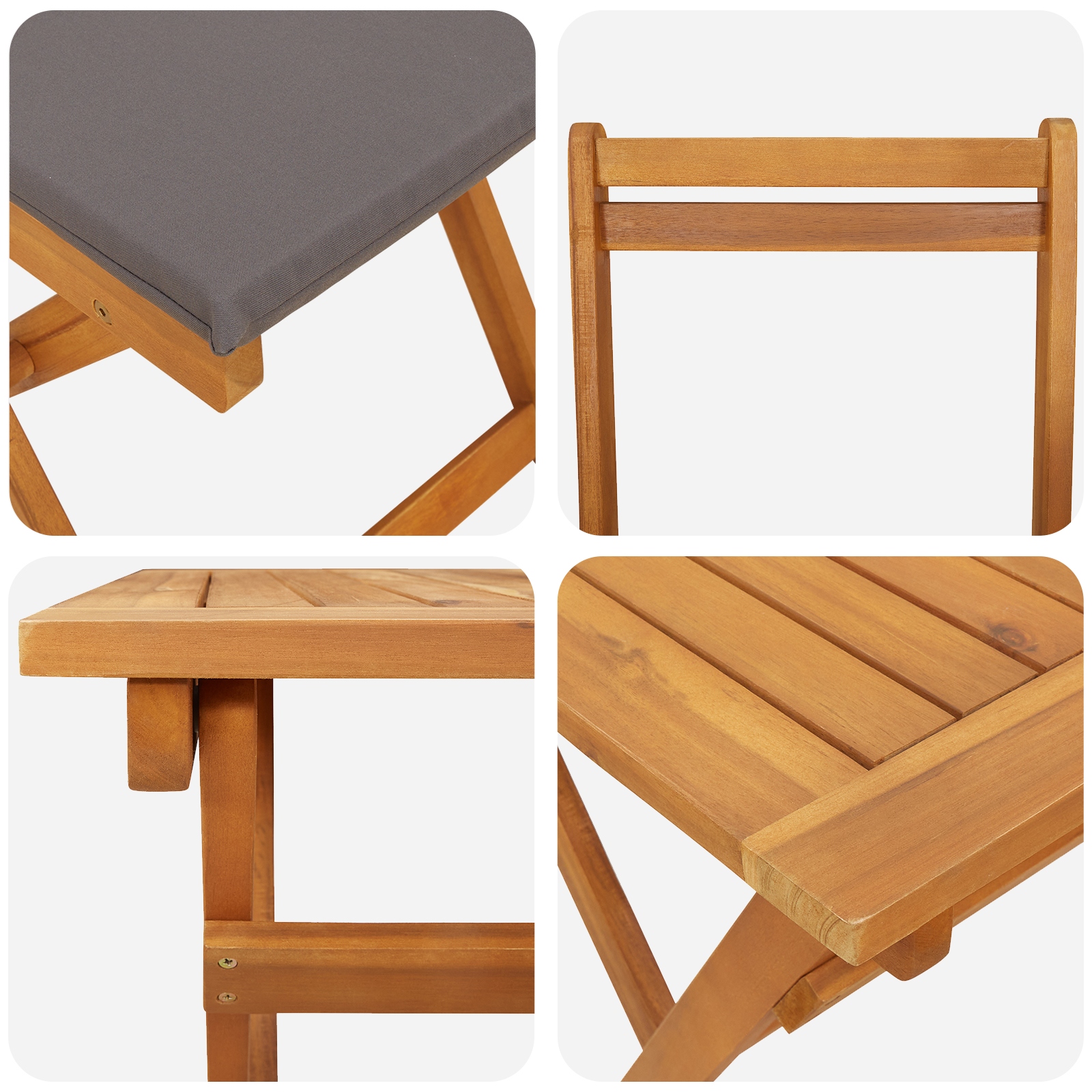 Táto bistro súprava je super prídavkom do každej vonkajšej oblasti, spája štýl a praktickosť a zlepší váš jedálenský zážitok. Vyrobená z masívneho akáciového dreva s pohodlnými tmavo šedými vankúšmi je perfektná na útulné jedlo alebo stretnutia vo vašej záhrade alebo na balkóne.