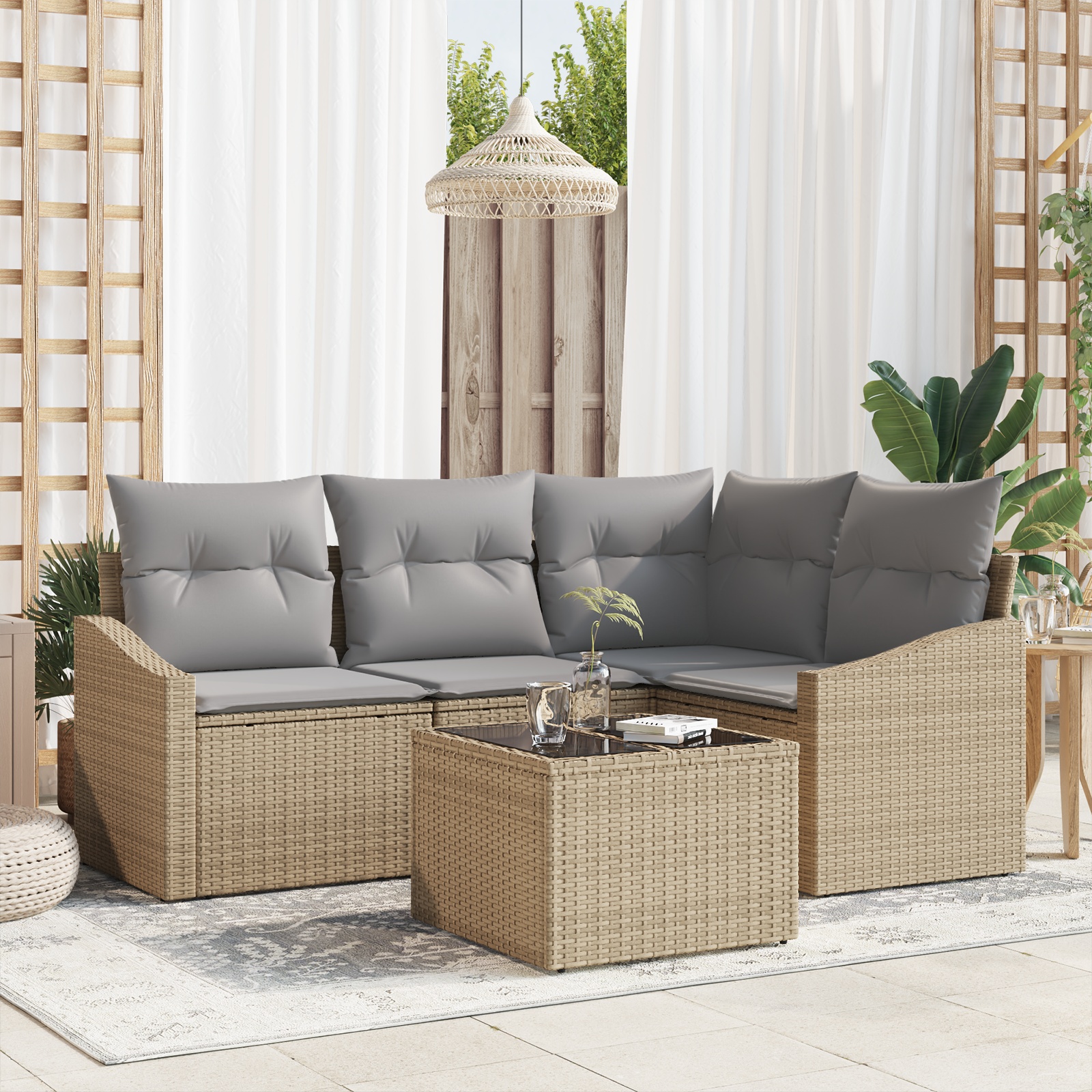 Tento 5-dielny vonkajší sekcionálny súbor pohoviek spája pohodlie a štýl presne tak, ako potrebujeme pre akékoľvek vonkajšie prostredie. Vankúše sú mäkké a textúrované, a vyzerajú skvele. Ideálne na balkóny a terasy, vytvárajú útulné miesto na stretávanie pod hviezdami.