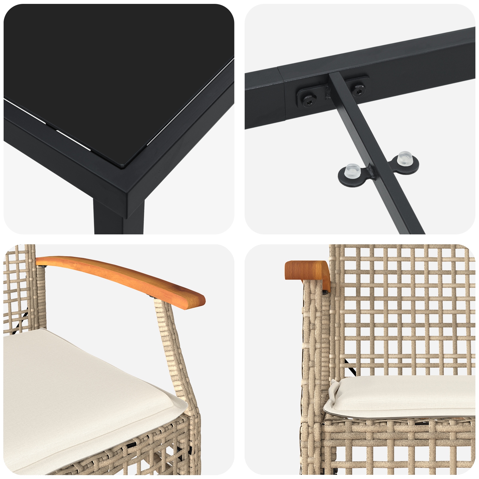 • Pohodlné sedenie: Každá stolička je s hrubými vankúšmi v krásnej krémovej farbe, ktoré robia čas strávený vonku naozaj príjemným.