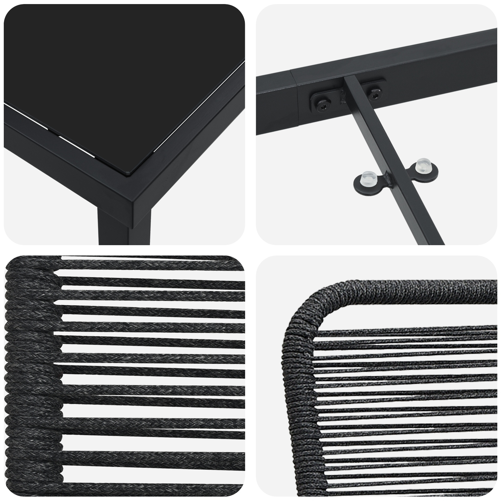Tento záhradný jedálenský set spája minimalistický dizajn a funkčnosť, takže sa hodí do vonkajších priestorov. Elegantné čierne bavlnené lano tkané okolo pevných rámov z ocele s práškovou úpravou nielenže vyzerá skvele, ale aj ponúka pohodlné sedenie pre až štyroch ľudí.