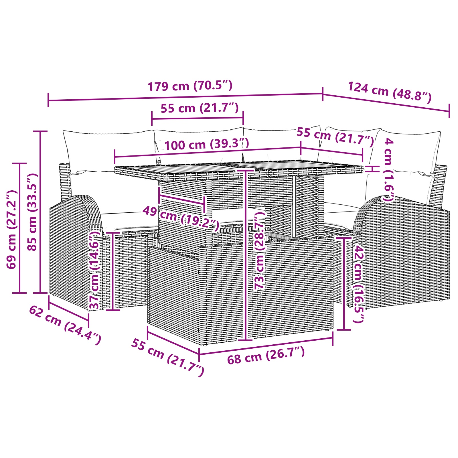 • Delivery Contains: 2 x Arm sofa including storage function, 1 x Corner seat including storage function, 1 x Centre seat including storage function, 1 x Garden table