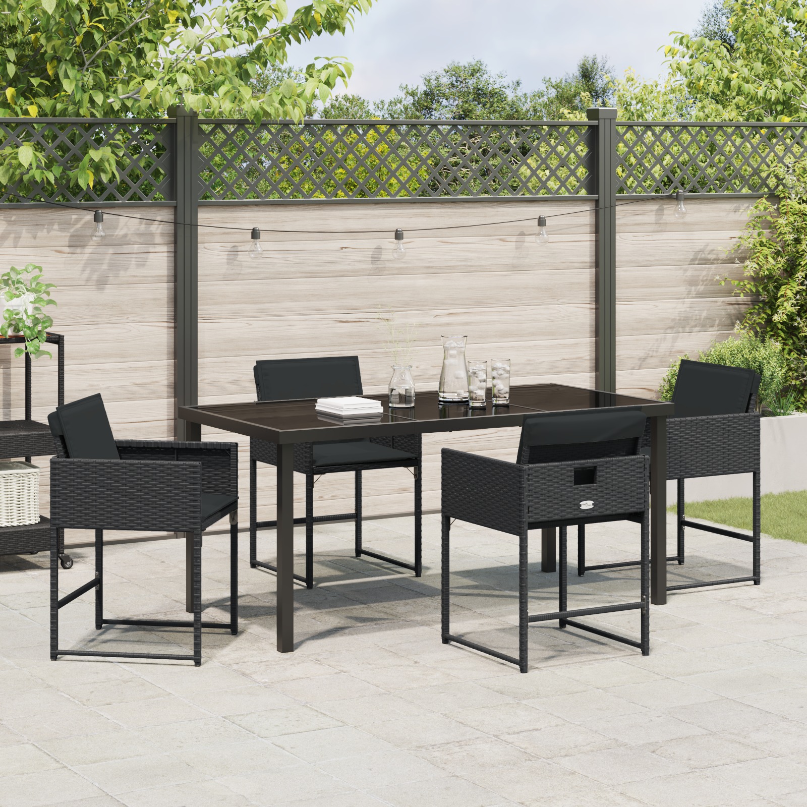 Tento patio jedálenský set je všetko o štýle a pohodlí, s moderným dizajnom, ktorý sa hodí do každej vonkajšej oblasti. Skvelý na rodinné jedlá alebo uvoľnené stretnutia s kamarátmi. Set obsahuje štyri pohodlné stoličky a veľký stôl, čo robí vonkajšie stolovanie super príjemné na tvojej terase, balkóne alebo v záhrade.