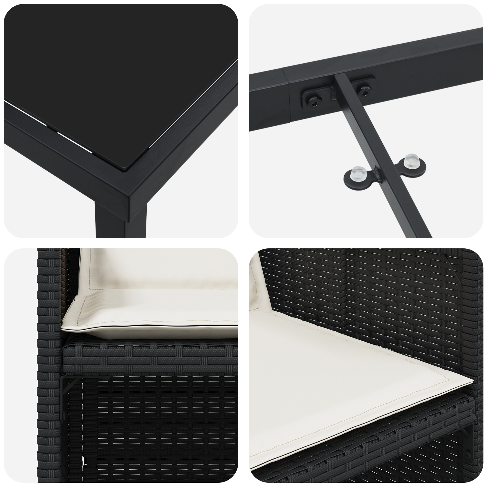 Tento záhradný jedálenský set je všetko o štýle a funkcionalite pre vonkajšie jedlá. Ideálny na posedenie na balkóne alebo na dvore. Elegantný čierny poly ratan a krémové vankúše dávajú pekný vzhľad, ktorý určite spríjemní každú vonkajšiu plochu, nech už hostíš kamarátov alebo relaxuješ s rodinou.