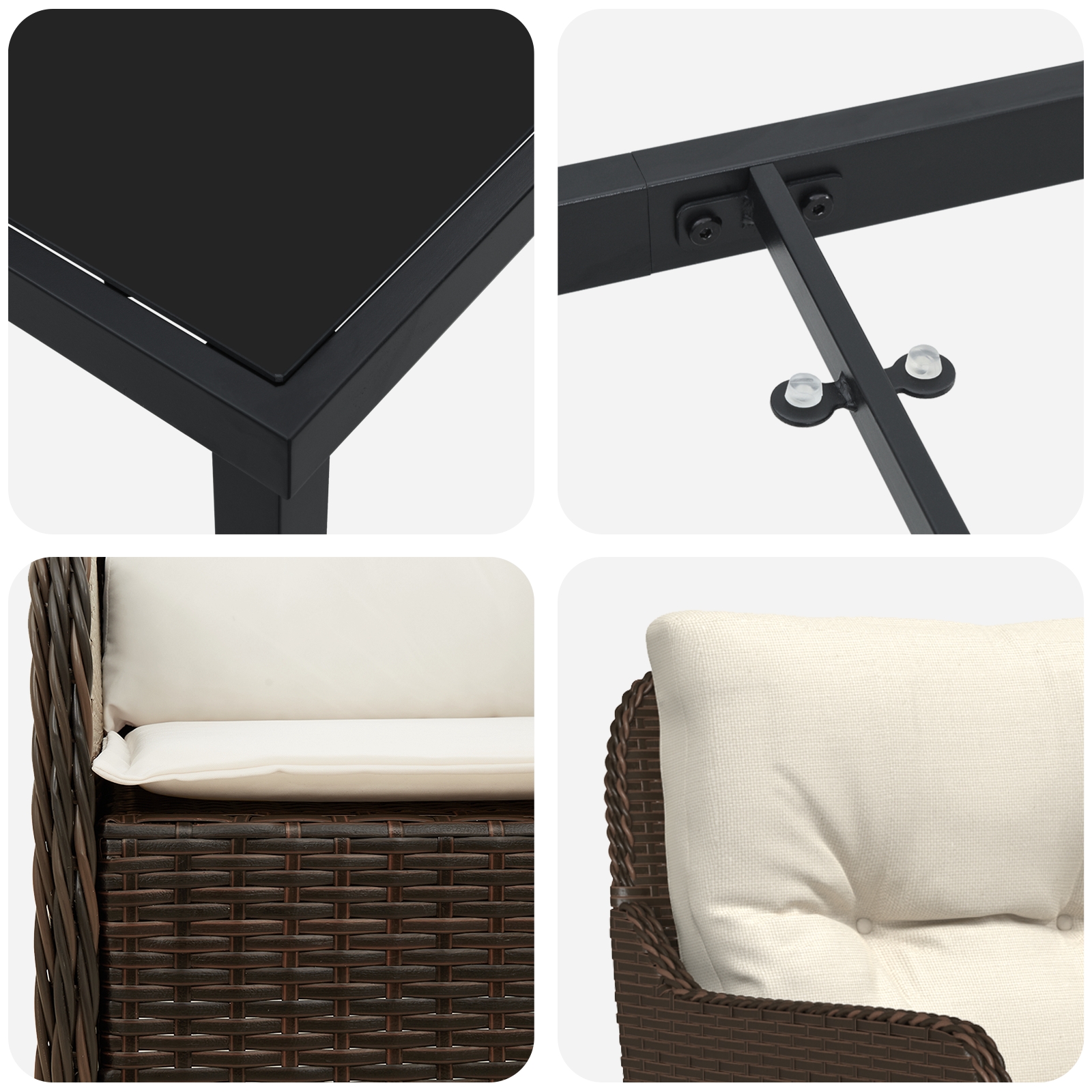 • Štýlový vzhľad: Moderné hnedé prevedenie s krémovo-bielymi vankúšmi vylepšuje akúkoľvek vonkajšiu výzdobu. Tieto stoličky sú ideálne na usporiadanie večere, vychutnávanie rannej kávy alebo len lenivú chvíľu na slnku.