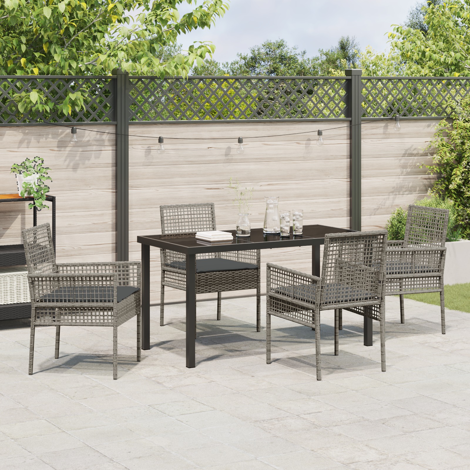 Tento záhradný jedálenský set má moderný dizajn, ktorý zlepší vašu vonkajšiu stolovaciu atmosféru s pohodlím a štýlom. So štyrmi elegantnými stoličkami a priestranným obdĺžnikovým stolom, dodá vašemu balkónu alebo terase šmrnc so svojimi peknými sivými a tmavosivými farbami.