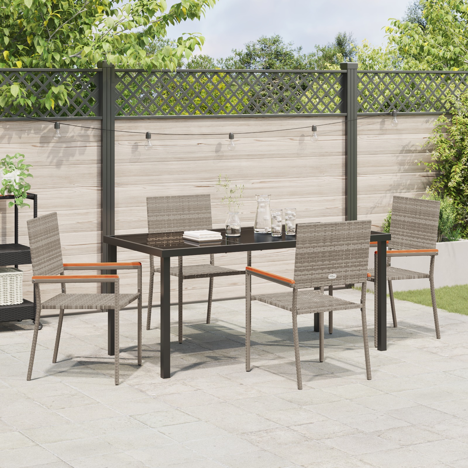 Tento 5-dielny záhradný jedálenský set kombinuje moderný štýl s praktickosťou, čo z neho robí skvelú voľbu na vonkajšie jedlo a oddych. Obdĺžnikový stôl a štyri pohodlné stoličky vytvárajú príjemný priestor na jedlo alebo neformálne stretnutia, spájajúce ľudí v skvelej atmosfére na patio, dvore alebo balkóne.