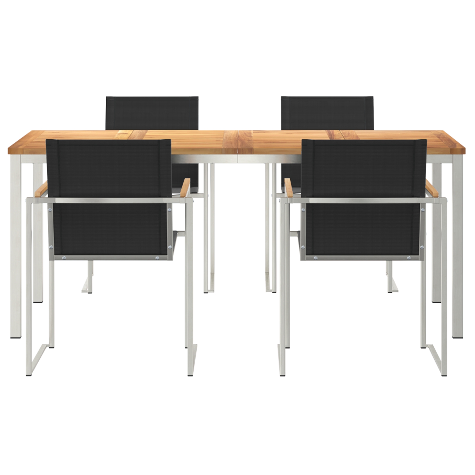 Tento záhradný jedálenský set je super voľba na vonkajšie jedlá, ponúka veľký obdĺžnikový stôl a štyri pohodlné stoličky. Kombinuje masívne teakové drevo s odolnými oceľovými rámami s práškovou úpravou, takže je to štýlový a praktický doplnok na akýkoľvek balkón či do záhrady.