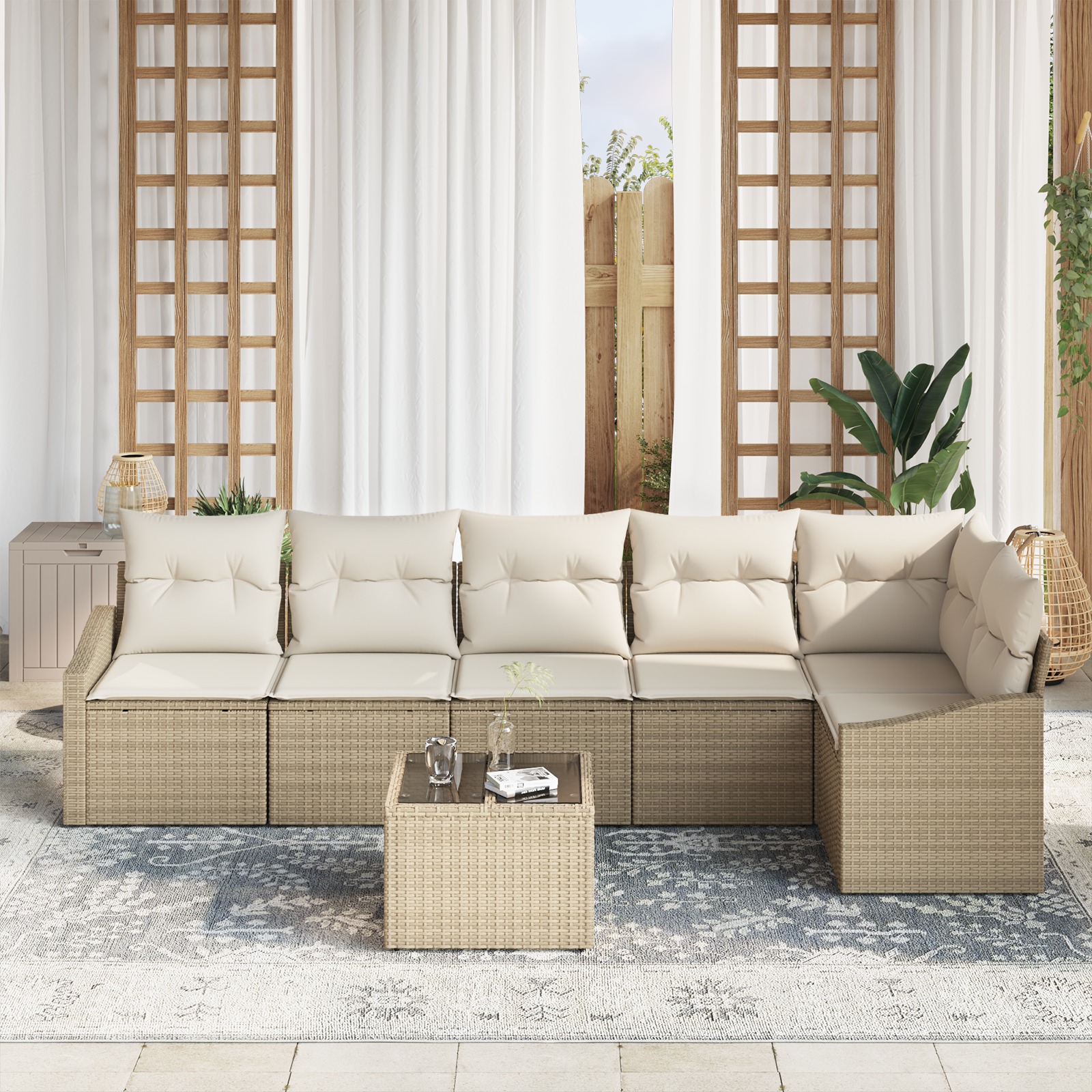 Toto vonkajšie sedenie je cool mix pohodlia a štýlu, ideálne pre zážitky z vonkajšieho bývania. Je vyrobené z odolného hnedého poly ratanu a mäkkých béžových vankúšov – super miesto pre priateľov a rodinu na obed vonku alebo relaxovanie pod hviezdami.
