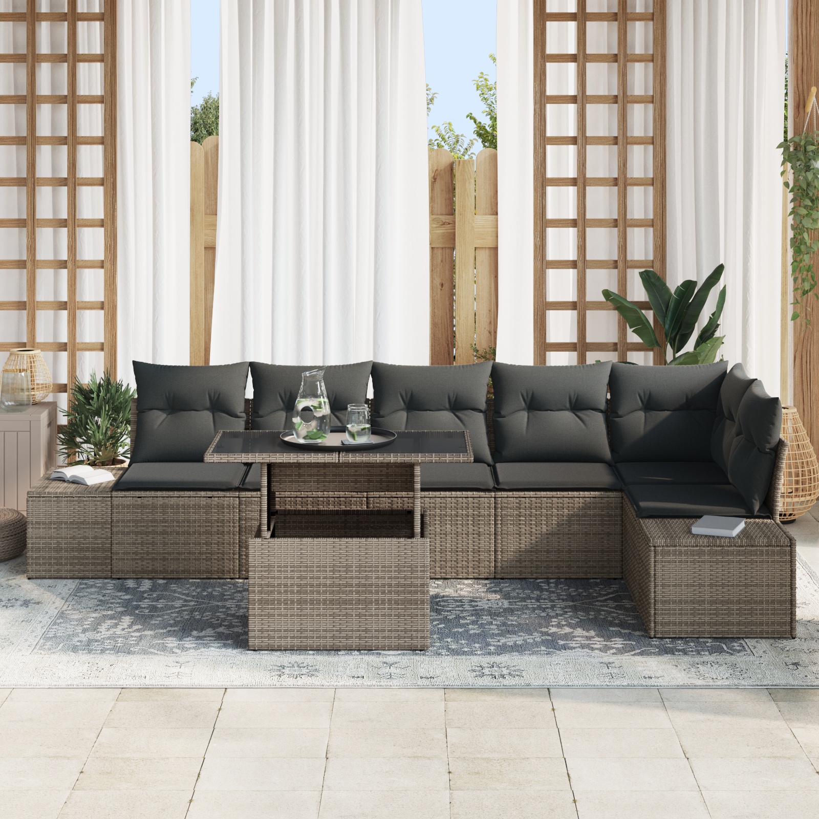 Táto 7-dielna záhradná pohovka spája štýl s praktickosťou, ideálna na vonkajšie ležanie a zábavu. Jej moderný vzhľad oživí atmosféru terás, balkónov a záhrad, takže ty a tvoji hostia sa môžete cítiť komfortne.