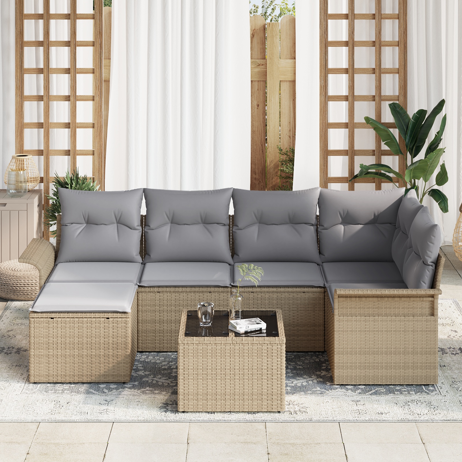 Tento set záhradných pohoviek je skvelou kombináciou pohodlia a praktickosti, navrhnutý pre vonkajšie sedenie. So svojim moderným obdĺžnikovým tvarom a štýlovými béžovými a svetlosivými farbami skvele zapadne na akýkoľvek balkón alebo do záhrady, poskytujúc pohodlné miesto pre až štyroch dospelých.