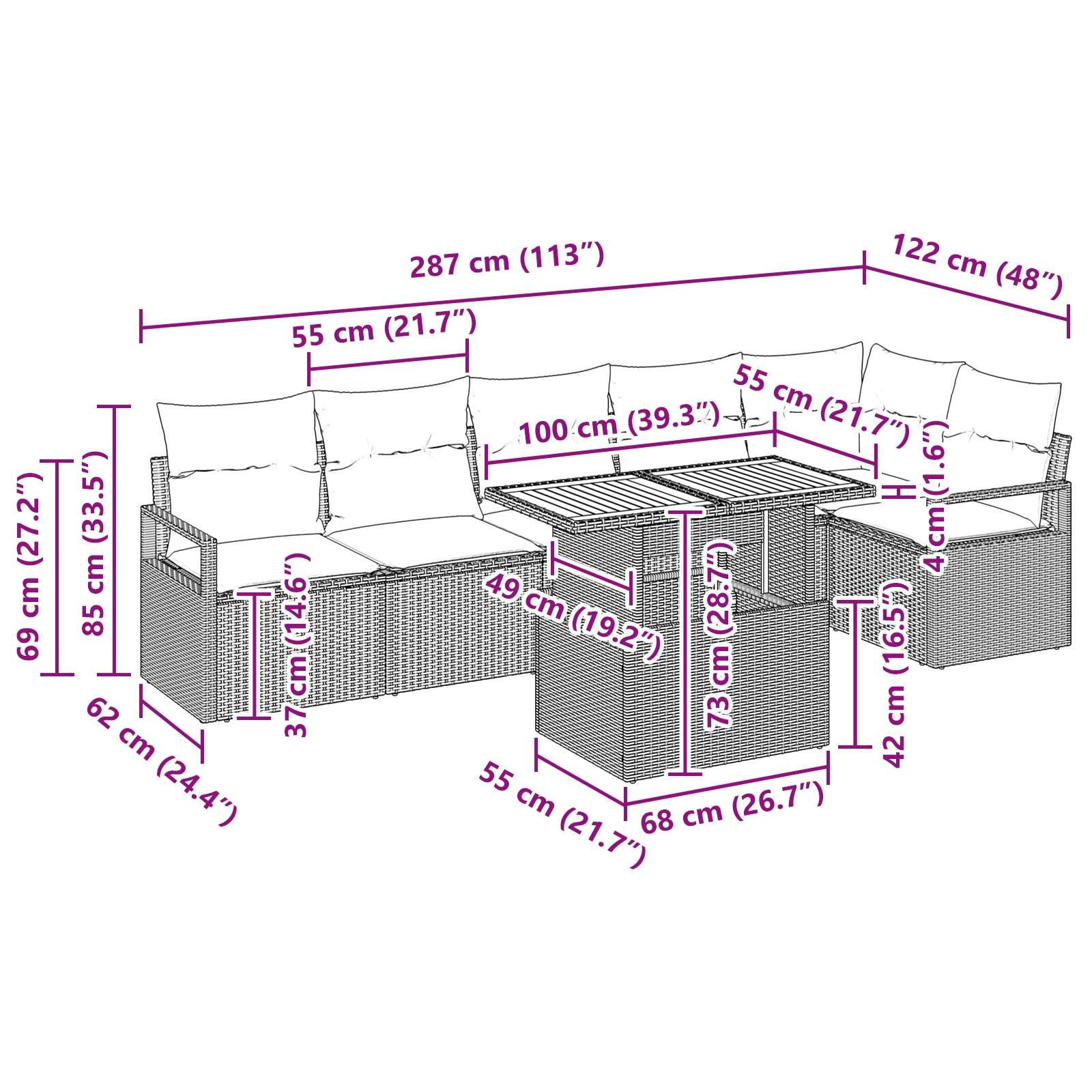 Tento 7-dielny záhradný pohovkový set je skvelý doplnok tvojej vonkajšej plochy, dodá moderný vzhľad, ktorý oživí tvoj balkón alebo skleník. Ručne tkaný poly ratan a mäkké vankúše vytvárajú útulný priestor na relaxáciu, ideálne do akéhokoľvek štýlu terasy alebo záhrady.