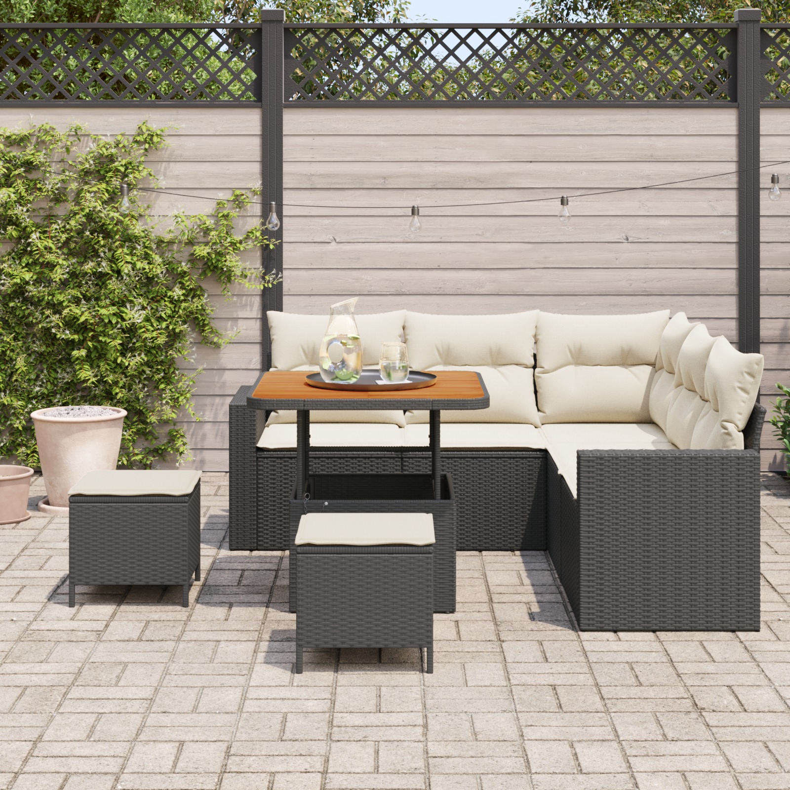 • Modulárny dizajn umožňuje prispôsobiť gaučový set tak, aby vyhovoval vášmu vonkajšiemu priestoru a poskytoval flexibilitu pri zábave pre rodinu a priateľov.