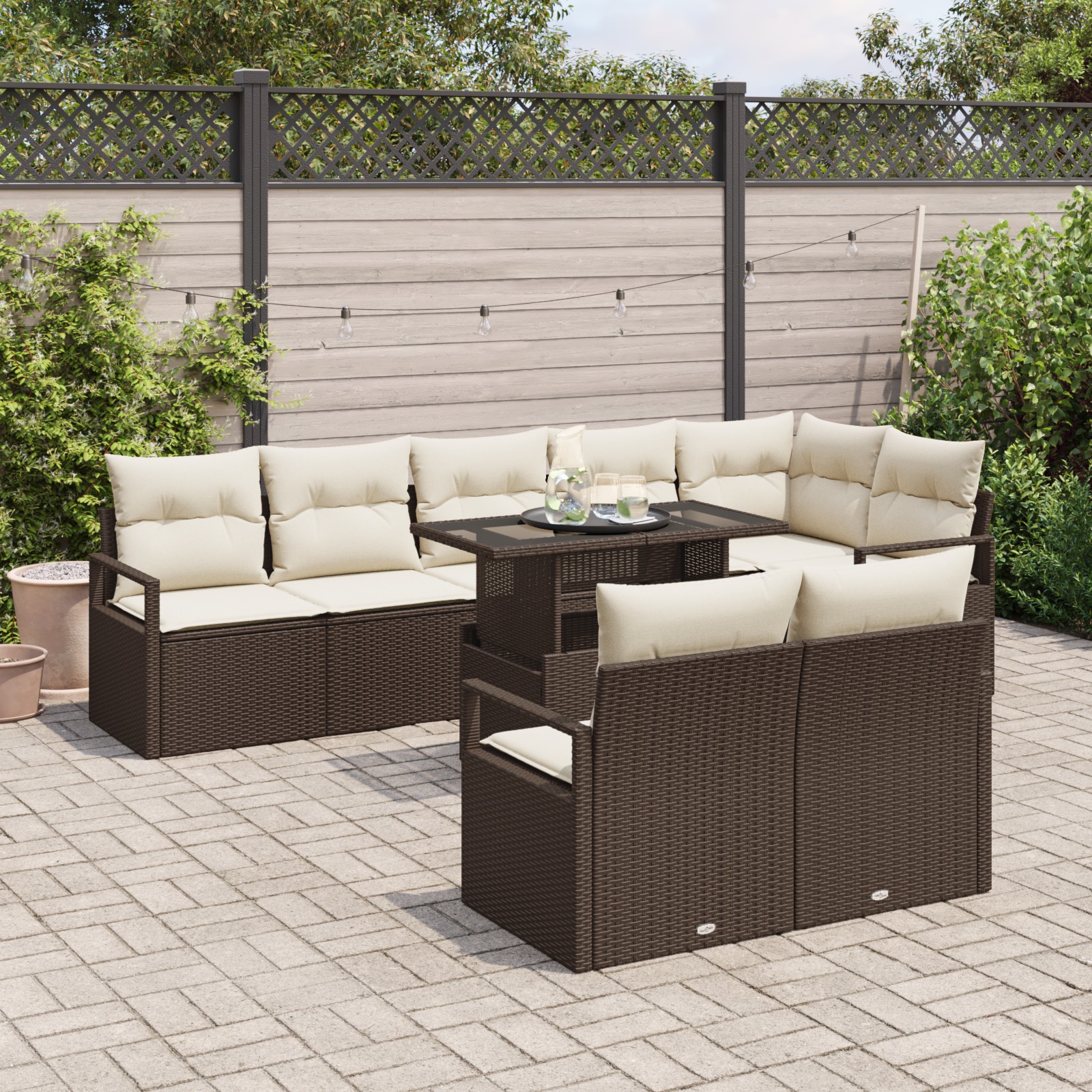 Táto 9-dielna súprava záhradných pohoviek poskytuje vynikajúci zážitok zo sedenia pre vonkajšiu zábavu a chvíle oddychu. S moderným dizajnom a štýlovými hnedými a krémovými farbami sa hodí do každej terasy alebo záhrady a vytvára príjemný priestor na zábavu s rodinou a priateľmi.