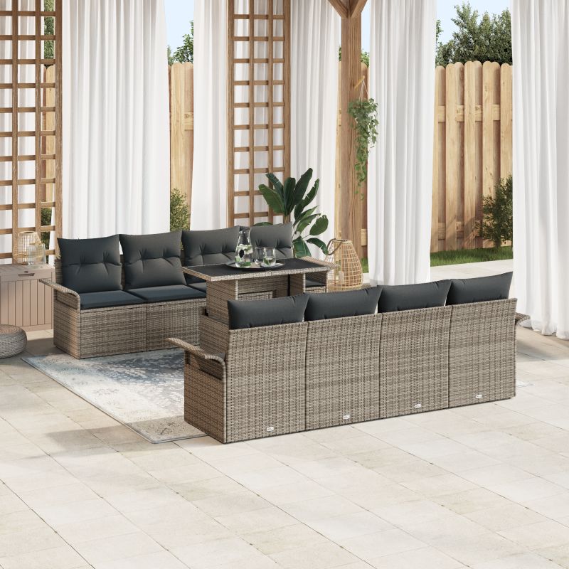 Tento 9-dielny záhradný gauč je super prírastok do tvojho vonkajšieho priestoru. Spojuje pohodlie so štýlom pre akékoľvek tvoje relaxačné potreby. S moderným dizajnom a elegantným sivým poly ratanom, ako aj pohodlnými sivými vankúšmi, je ideálny ako na malé stretnutia, tak aj na väčšie akcie.
