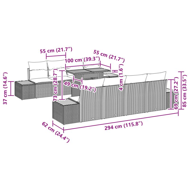 • Materiály odolné voči poveternostným vplyvom: Vyrobené z kvalitného poly ratanu a pevných polyesterových materiálov, tento gaučový set odoláva vonkajšiemu počasiu a zachováva si svoj elegantný vzhľad.