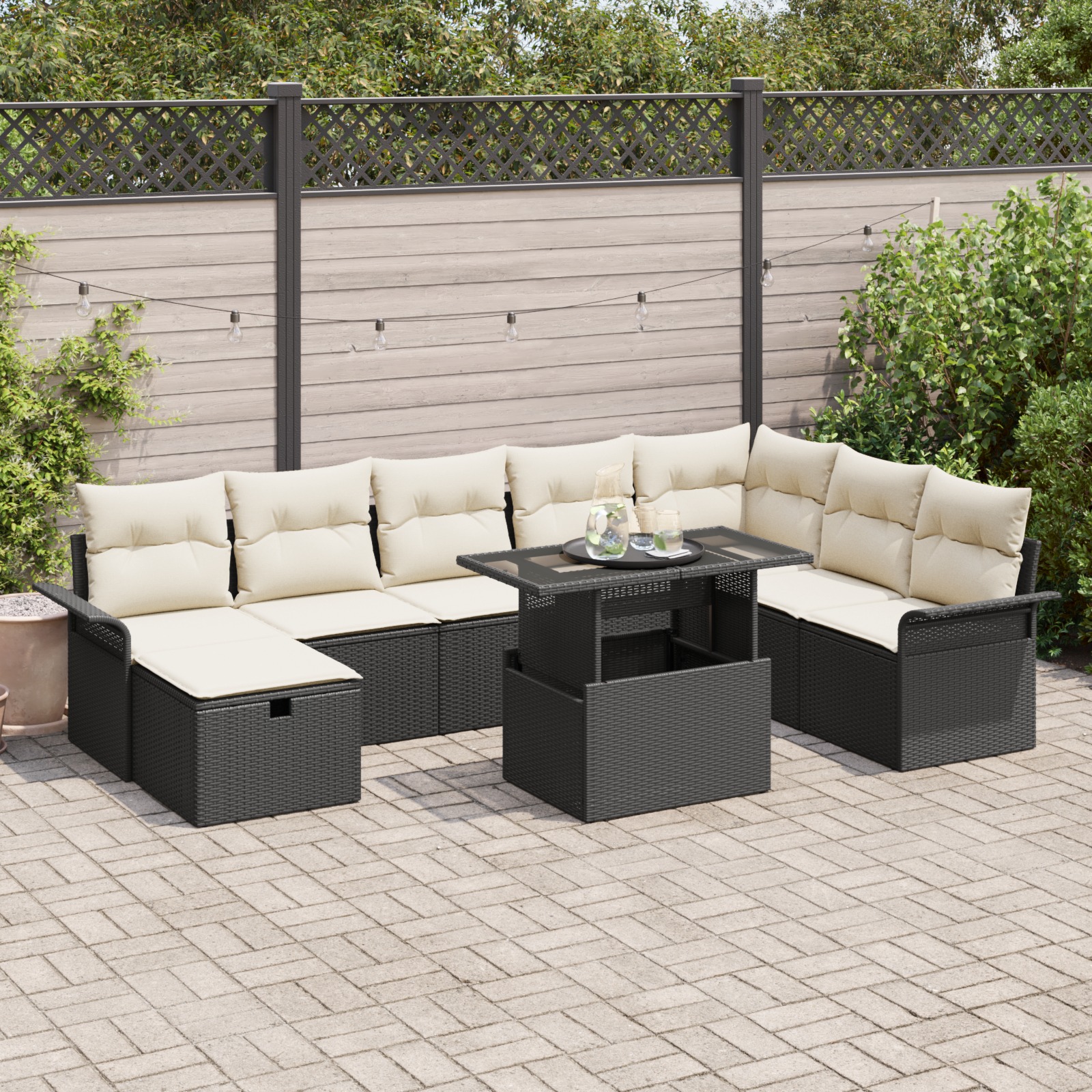 Tento 9-dielny záhradný gaučový set vyzerá parádne v akejkoľvek vonkajšej oblasti. Ideálny na vytvorenie pohodlného lounge pre až 8 osôb. Lesklý čierny poly ratan s jemnými béžovými vankúšmi vytvára príjemnú atmosféru, ideálnu na stretnutia, rodinné chvíle alebo len na vychutnávanie slnka v záhrade alebo na balkóne.