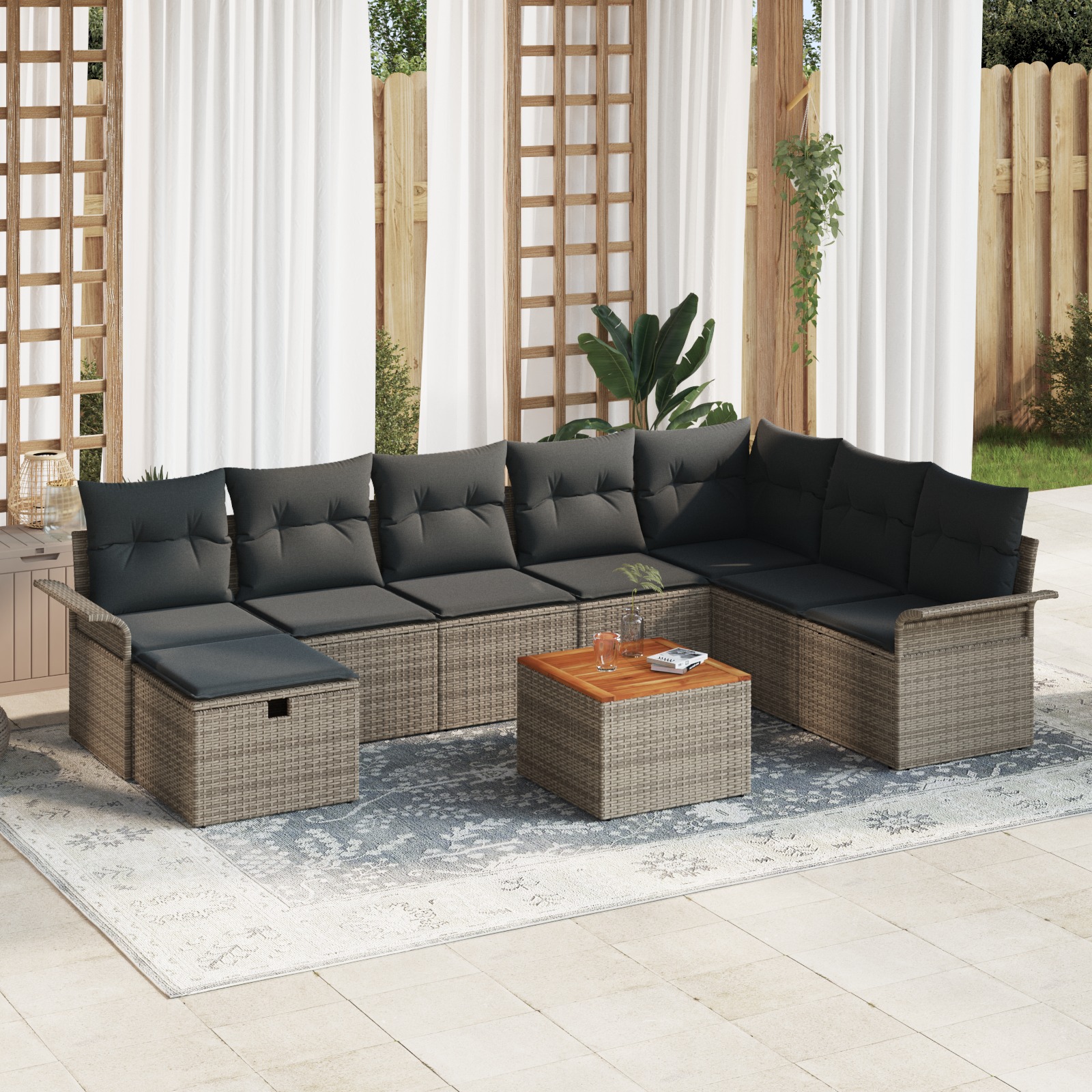 Tento záhradný pohovkový set so štýlovým šedým polyratanom premení akúkoľvek vonkajšiu plochu na pohodlné miesto na stretnutia. Modulárny dizajn ti dáva možnosť usporiadať ho rôznymi spôsobmi, či už si chceš užiť voľný čas alebo hostiť priateľov.