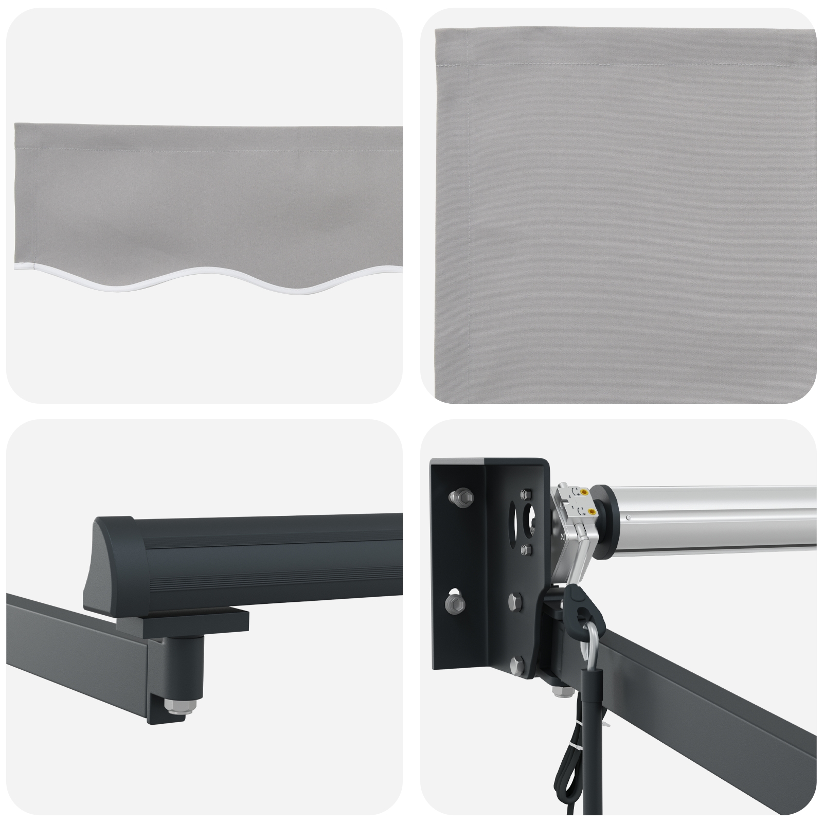 Tento automatický markíz je super spôsob, ako si užiť vonkajšie priestory a chrániť sa pred silným slnkom. Má moderný sivý dizajn, ktorý dodáva šmrnc a je ideálny na balkóny, skleníky alebo zimné záhrady. S pevným kovovým rámom a odolnou polyesterovou látkou pokrýva plochu 350 cm x 250 cm, čo vám dáva možnosť pohodlne si oddýchnuť počas slnečných dní.