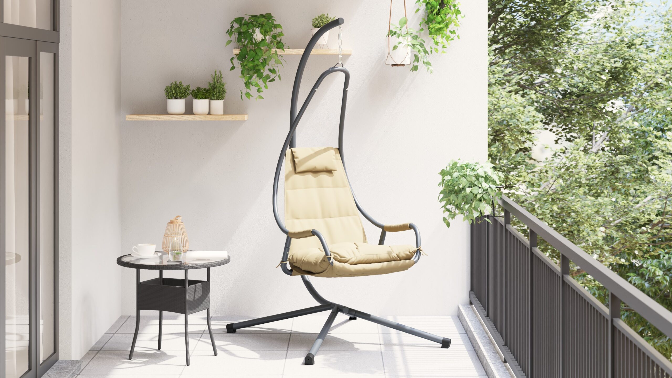 Tento hojací stolička spája štýlový dizajn a pohodlie, čo z neho robí perfektnú voľbu do vonkajšieho priestoru. Pôvabný béžový rám z ocele a jemná látka poskytujú pohodlné miesto na oddych vo vašej záhrade alebo na balkóne po celý rok.