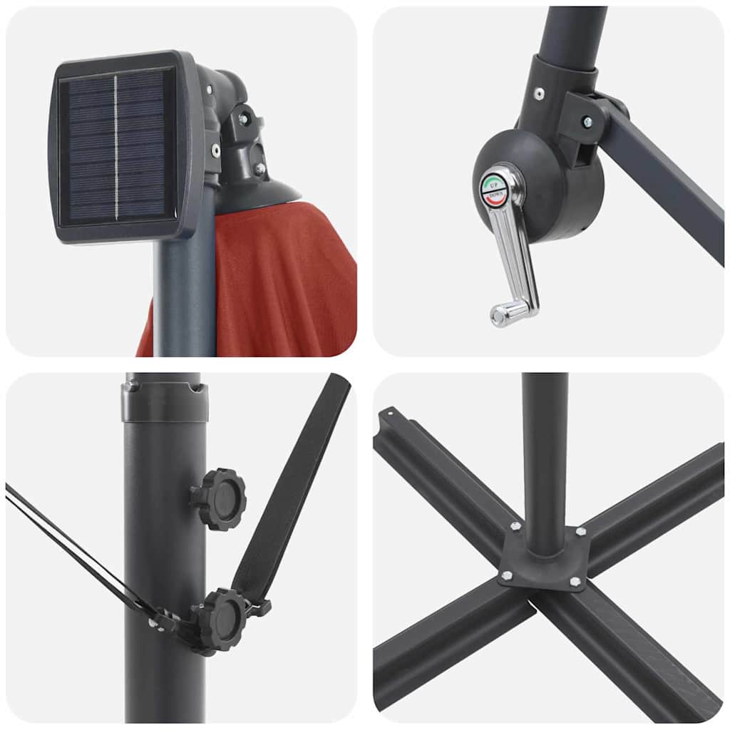 • Obsah balenia: Slnečník obsahuje LED solárne svetlá, ktoré osvetľujú večery bez potreby elektriny. Praktická ručná kľuka umožňuje ľahké otváranie a zatváranie, a sklopná funkcia ti dáva možnosť jednoducho nastaviť tieň.