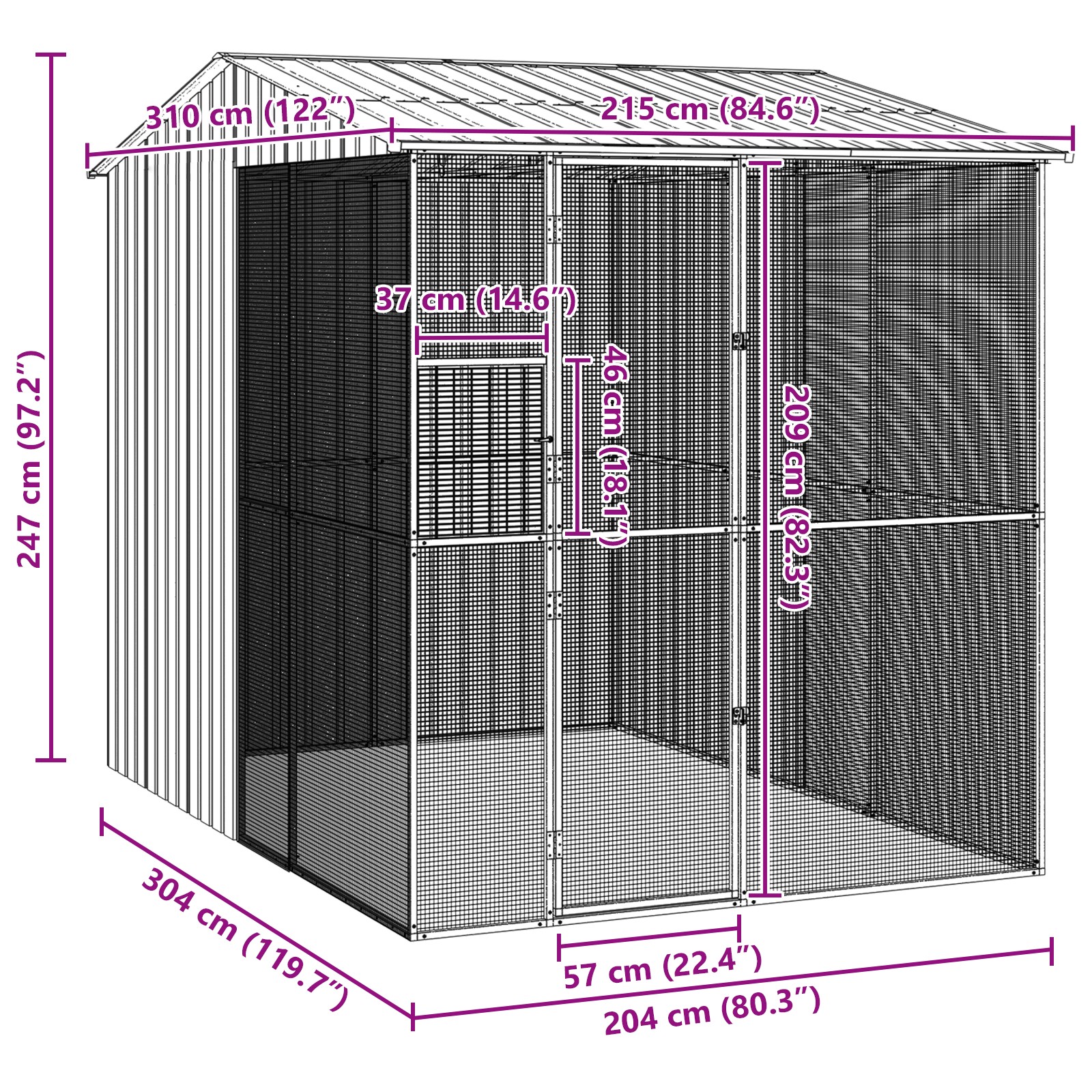 • Priestranné rozmery: S rozmermi 215 x 310 x 247 cm majú vaši vtáci dostatok priestoru pre natiahnutie krídiel a hranie, čím podporujú zdravý život vašich domácich miláčikov.