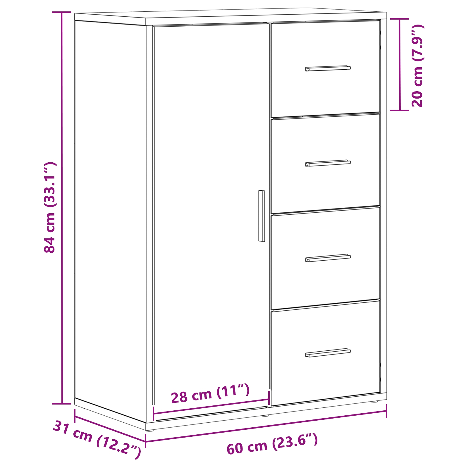 • Veľa úložného priestoru: S štyrmi praktickými zásuvkami, dvoma dverami s pántami a tromi nastaviteľnými policami je tento bočný stôl super na udržanie tvojich vecí v poriadku.