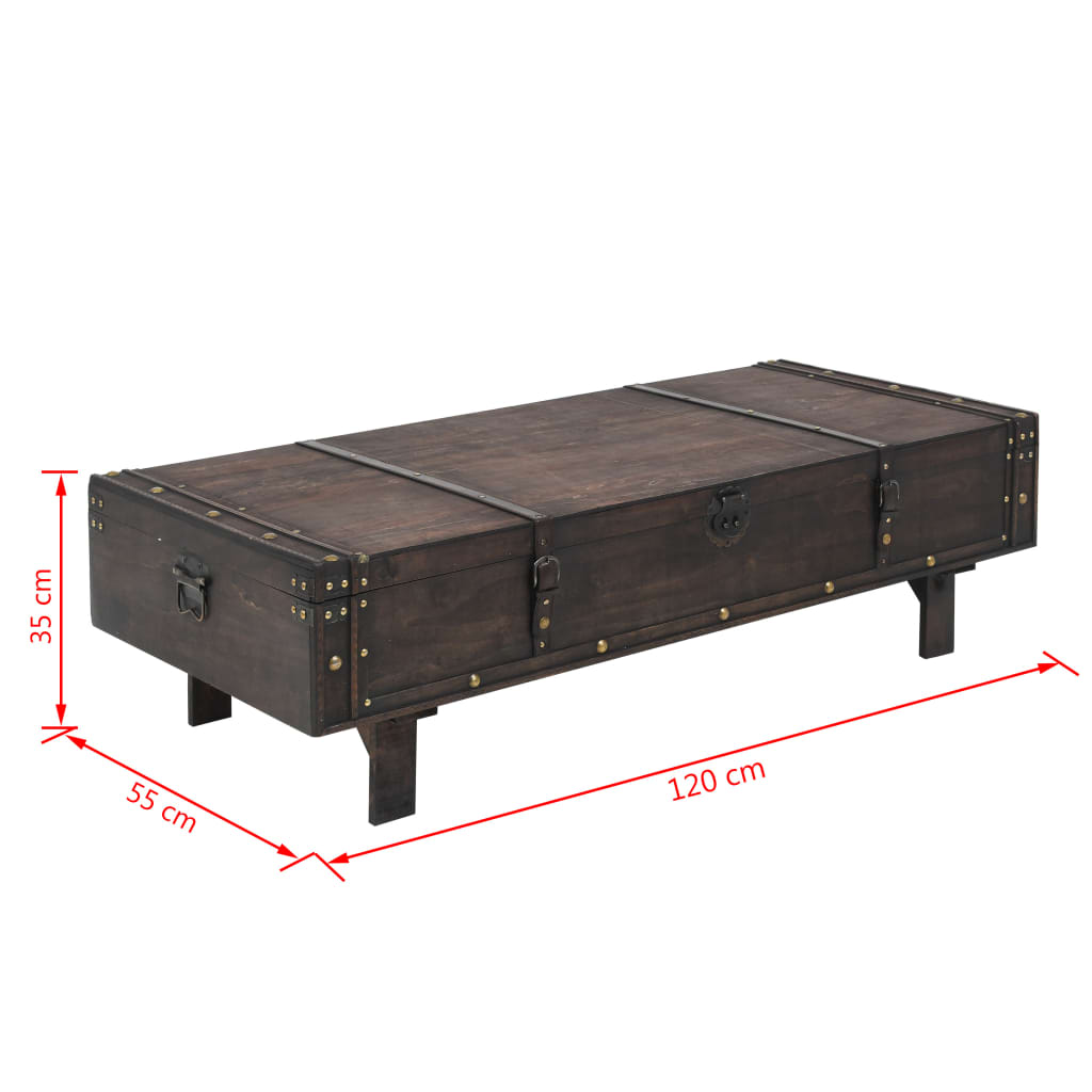 Tento konferenčný stolík je vyrobený z masívneho dreva so starožitne vyzerajúcou farbou. Má ozdobné popruhy z umelej kože a kovové prvky, ktoré dodávajú stolu vintage šarm. Drevený konferenčný stolík má vnútri veľký úložný priestor na oblečenie, knihy, časopisy a čokoľvek iné, čo potrebujete mať na dosah ruky, ale mimo dohľadu. Vďaka zámku a rúčkam v starožitnom prevedení sa konferenčný stolík jednoducho zatvára a presúva. Montáž je jednoduchá.