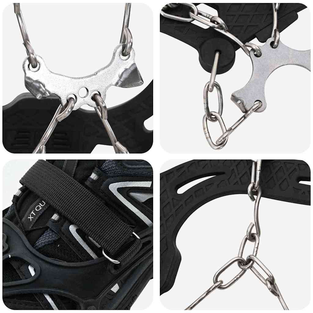 • Funkcie / dizajn: Každý hrot má 10 zubov z nehrdzavejúcej ocele, čo zlepšuje účinnosť úchopu na klzkom povrchu. Navyše, rýchlonastaviteľné pásky uľahčujú nasadenie a zloženie, čím sa zvyšuje pohodlie a zaručuje, že pevne držia na väčšine obuvi, od turistických čižiem po trailové bežecké topánky.