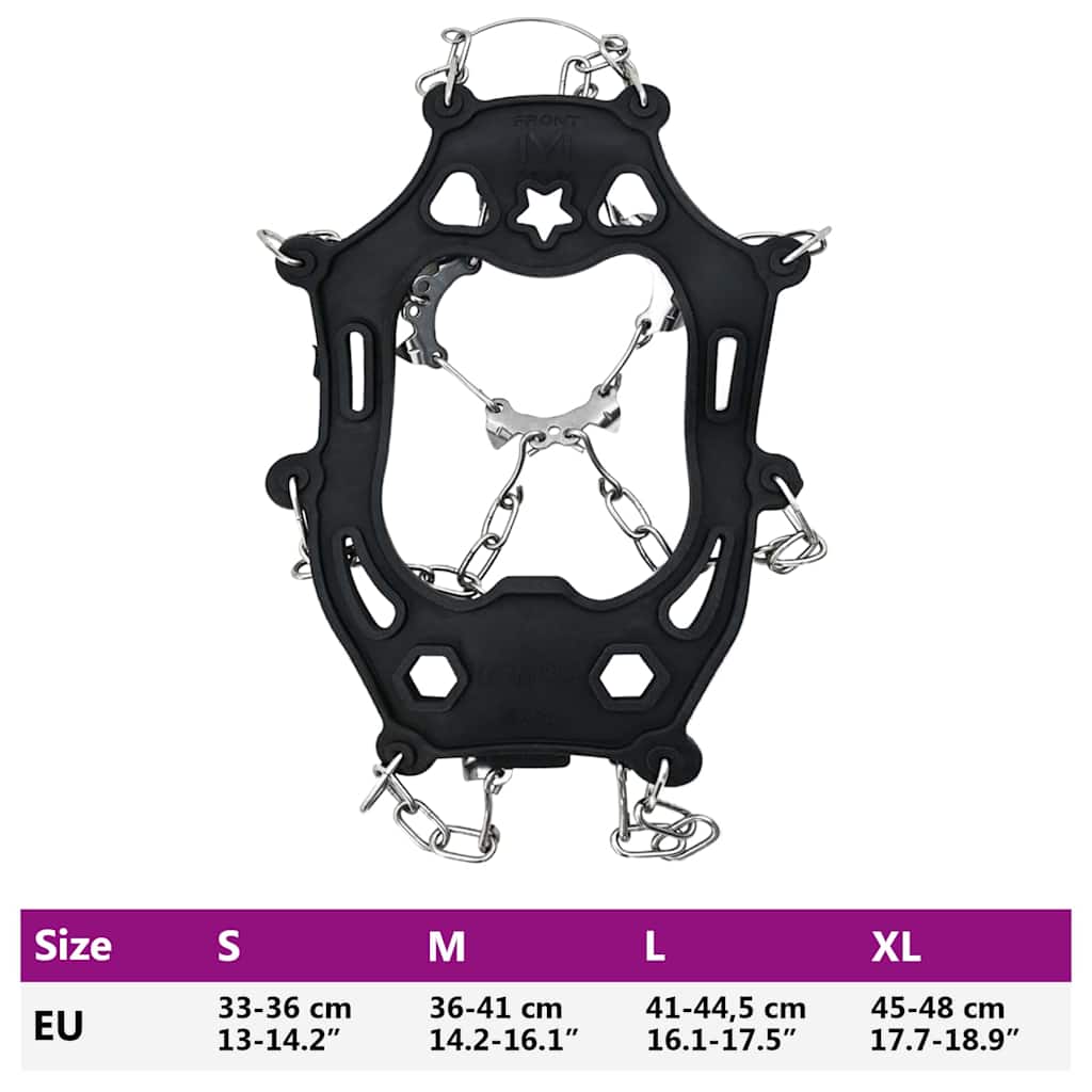 • Materiály: Vyrobené z kvalitného termoplastického elastoméru a nehrdzavejúcej ocele, ktoré zaručujú skvelú trvanlivosť a výkon. Elastomér je flexibilný a odolný, čo vám umožní rýchlo sa pohybovať po rôznych terénoch. Nehrdzavejúce zuby zaručujú dlhodobú pevnosť a bezproblémovú údržbu.
