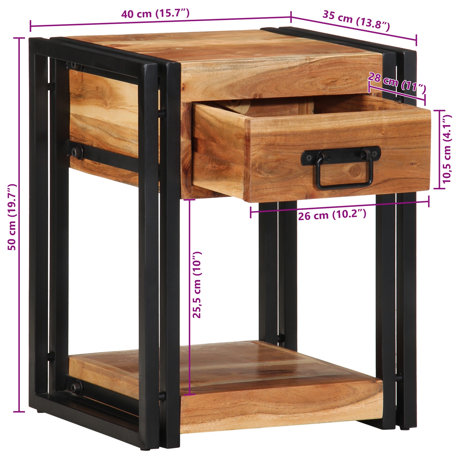 Tento nočný stolík spojuje štýl a praktickosť, perfektne ozdobí každú spálňu. Má krásny povrch z masívneho akáciového dreva, ktorý ukazuje jeho prirodzenú štruktúru, spolu s pevným čiernym železným rámom – vyzerá skvele a je určený na dlhé používanie.
