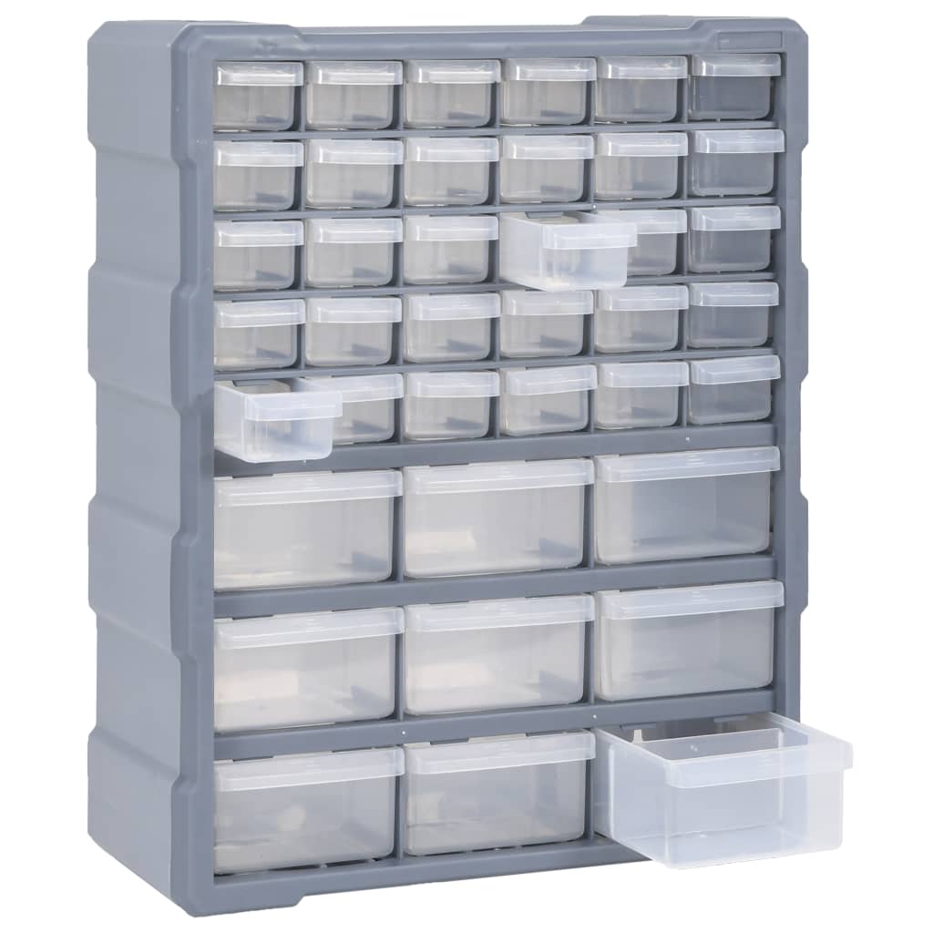 Úložná jednotka obsahuje 30 malých zásuviek a 9 stredne veľkých zásuviek, do ktorých si budete môcť odložiť náradie rôznych veľkostí a ktoré sa postarajú o to, aby bolo vaše ručné náradie a príslušenstvo, ako napríklad rôzne spojovacie prvky, vždy prehľadne uložené a poruke. Skrinka na náradie je vyrobená z nárazuvzdorného plastu, ktorý je trvácny a stabilný. Zásuvky sú vyrobené z priehľadného plastu, a tak hneď uvidíte, čo je vo vnútri. Box poskytuje ideálne miesto na odkladanie matíc, skrutiek, klincov, úchytov a rôznych iných súčiastok.