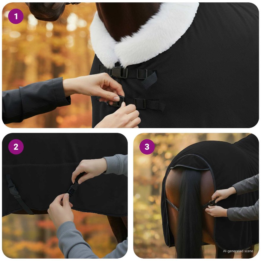 • Všestranný dizajn poťahu: Odnímateľný poťah pre jednoduchú údržbu. Dá sa ľahko zložiť a prať na 30 stupňov, čo udržiava deku čistú a sviežu bez veľa námahy. Takto máte viac času na svojho koňa.