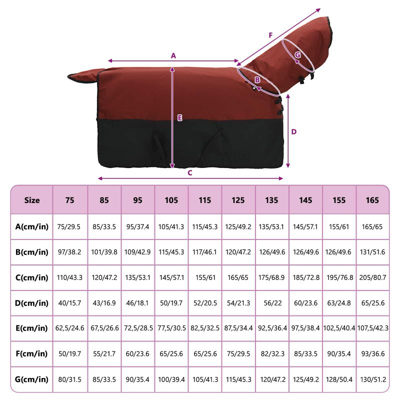 • Vysokokvalitný polyester: Oblek je z vodotesného polyesteru, ktorý účinne ochráni pred dažďom aj snehom. Je to trvanlivý materiál, ktorý udrží kone v teple aj v nepriaznivom počasí, zatiaľ čo vy sa nemusíte báť o ich pohodu. ľahké čistenie v práčke zabezpečuje dlhú životnosť a stále skvelý vzhľad.