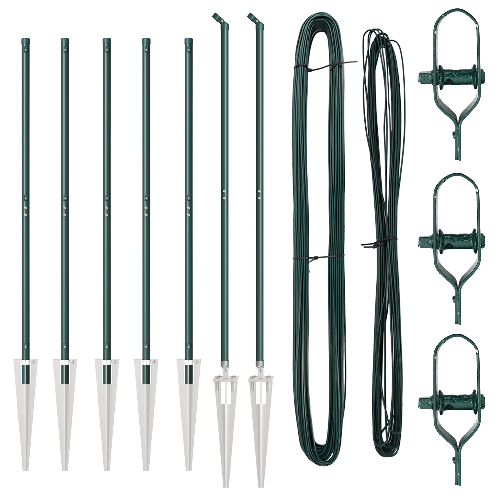 • Obsah doručenia: 5 x stĺp, 2 x uholný stĺp, 5 x kolík, 2 x uholný kolík, 5 x plastová krytka, 15 x plastová podpora napínacieho drôtu, 15 x skrutka na plastovej podpore, 2 x kryt uholného stĺpa, 2 x hardvér uholného stĺpa, 3 x napínač, 1 x 25m viazací drôt, 1 x 33m napínací drôt